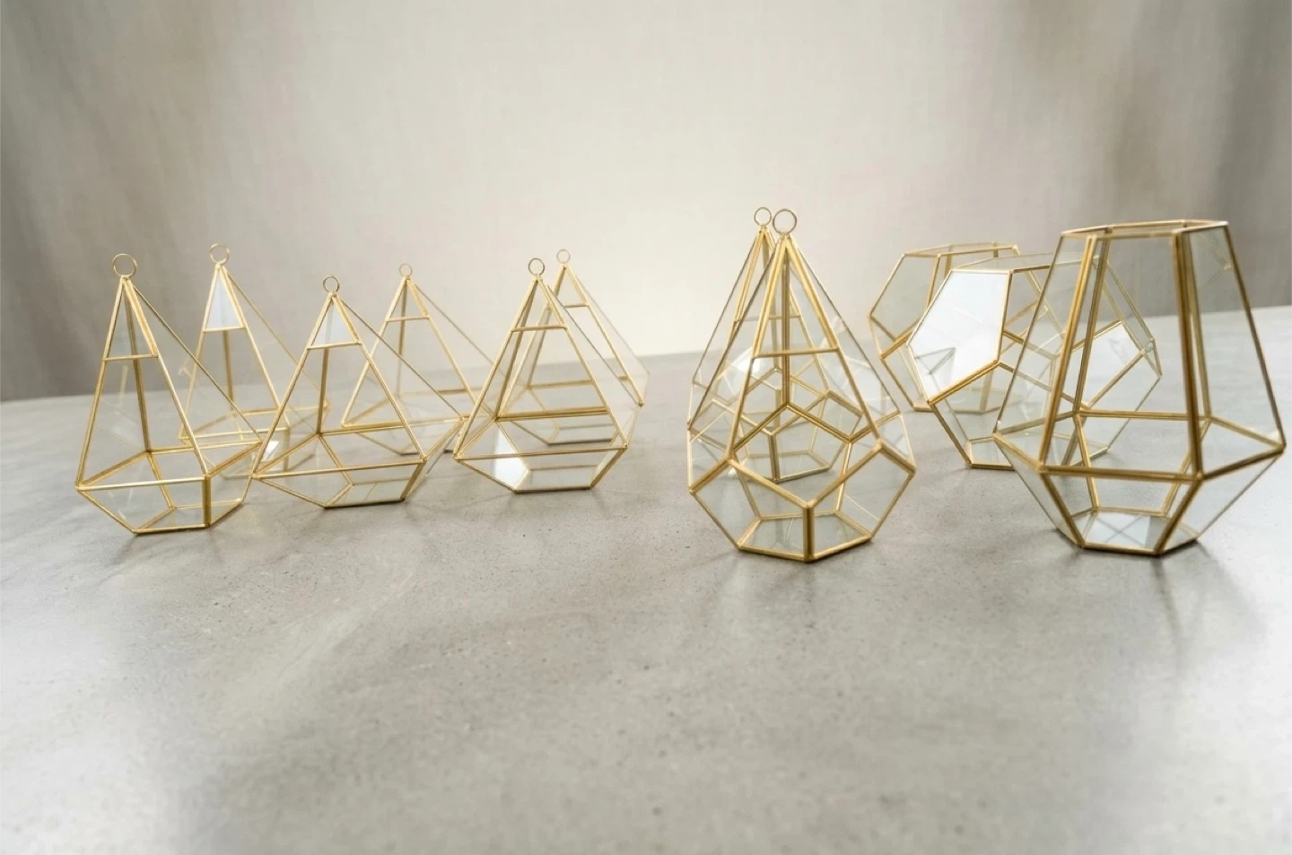 Moving sale, pick up asap. Geometric glass terrarium with gold-toned metal trim. Perfect for plants/candle holder decor. Total 12 pieces in various shapes as in the picture.