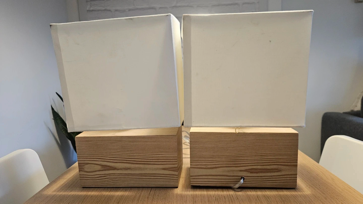 Selling a pair of lamps with a square, off-white shade and a wood base. They would look great in any room!