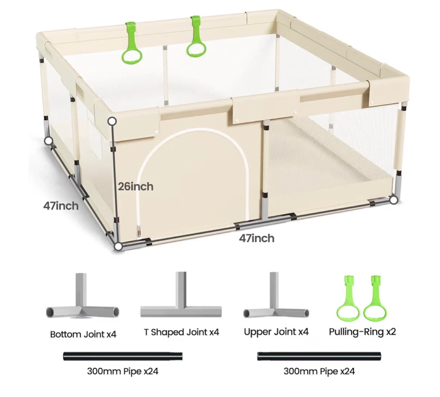 This baby playpen is 47 inches by 47 inches and 26 inches high. It's made of durable fabric and comes with pulling rings for added fun. The included balls provide extra entertainment for little ones!