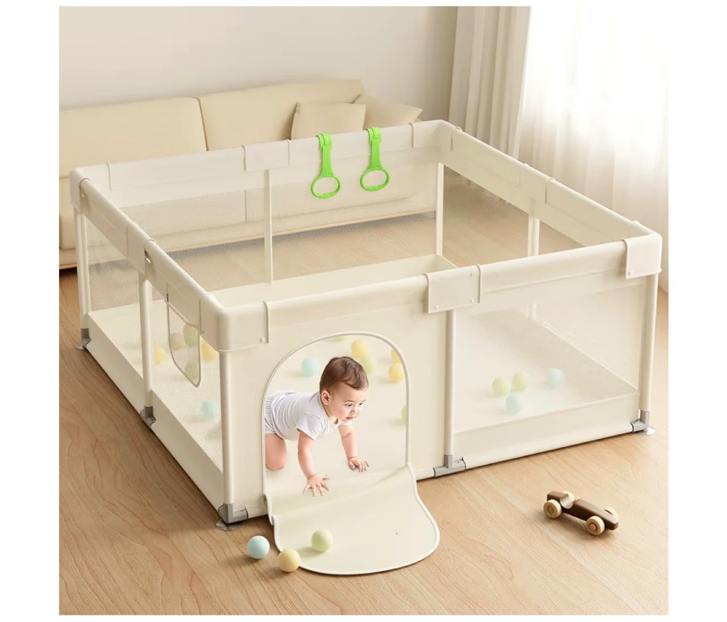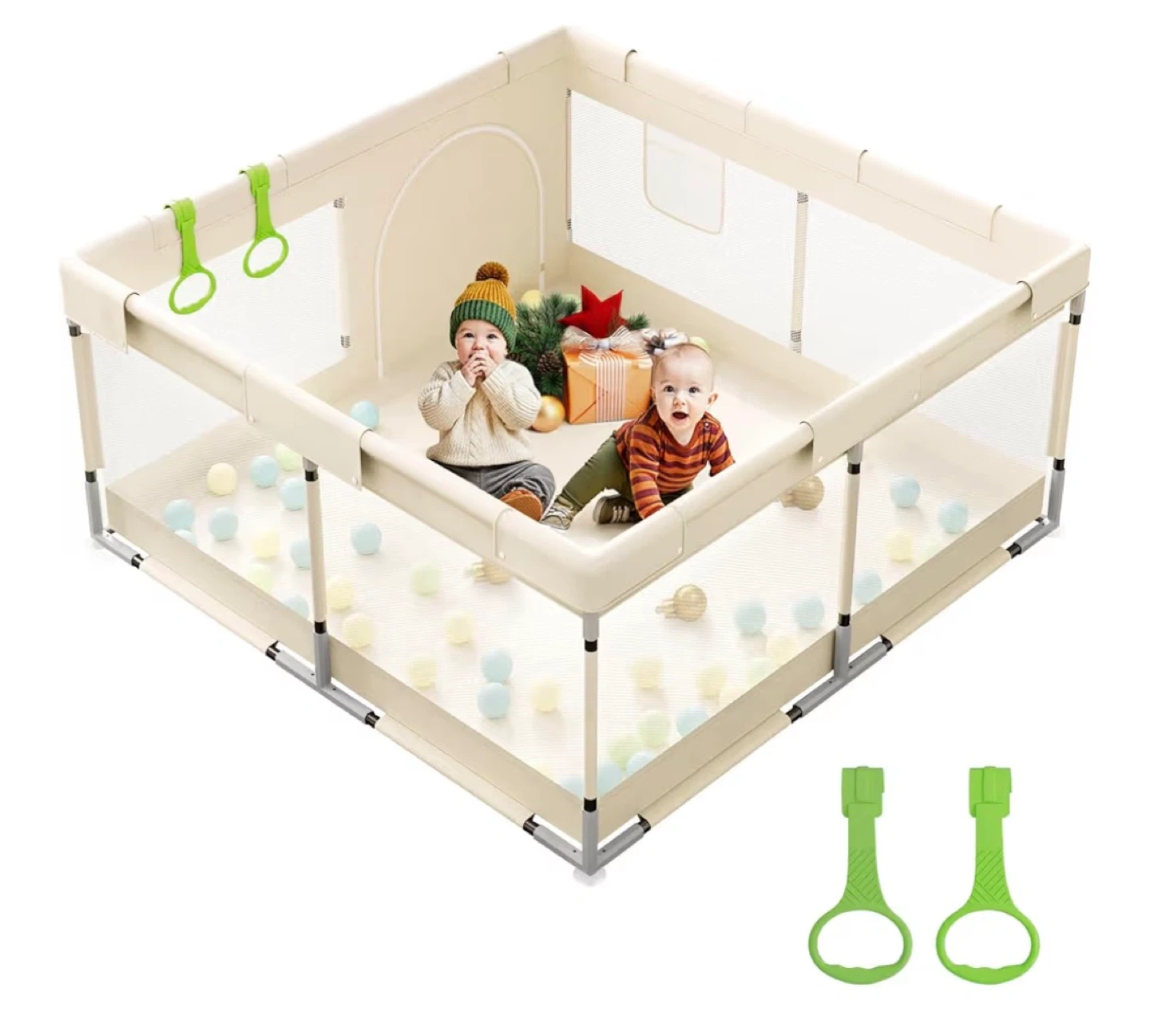 This baby playpen is 47 inches by 47 inches and 26 inches high. It's made of durable fabric and comes with pulling rings for added fun. The included balls provide extra entertainment for little ones!