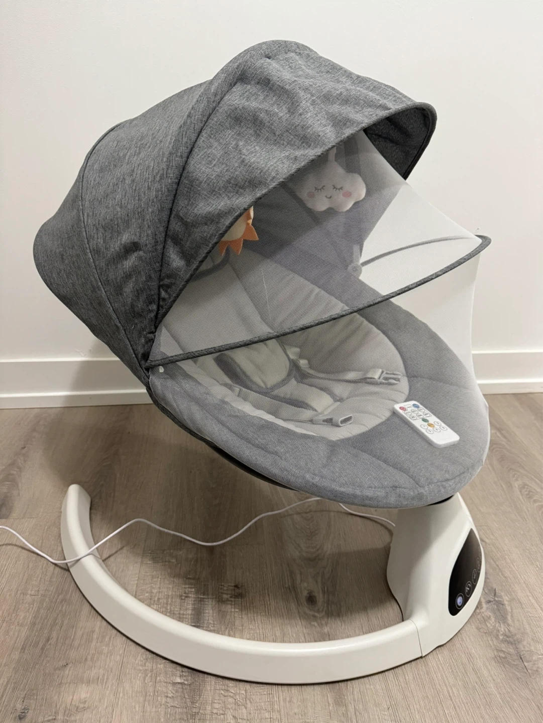 This swing is designed to gently soothe your baby with 5 natural rocking motions that mimic a mother’s hug. It features a super soft, washable seat cushion, a convenient LED touch panel, remote control, built-in music, and timer settings. It’s also foldable and portable, making it perfect for both indoor and outdoor use.