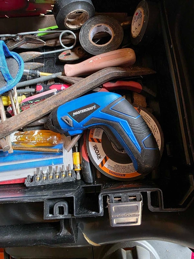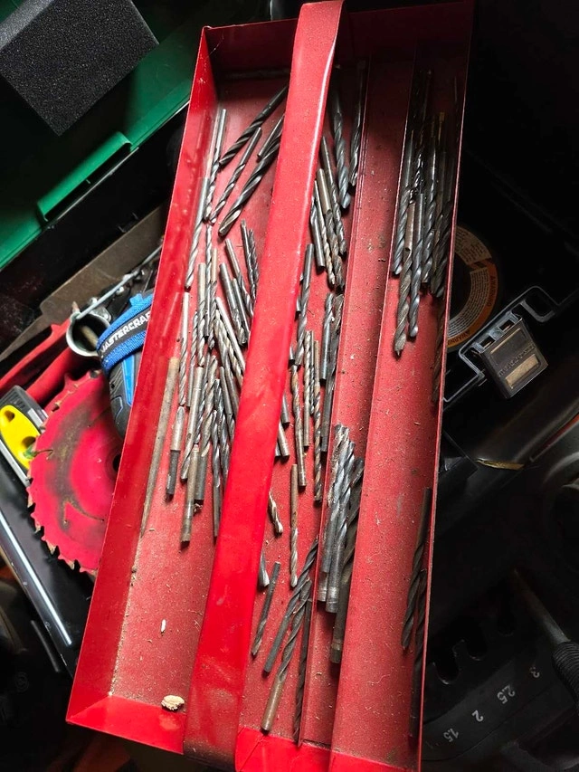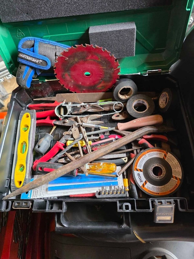 Assorted tools including pliers, screwdrivers, drill bits, tape, an electric screwdriver, files, punches, a level, and some other random items. $20. Pick up on St. Williams.