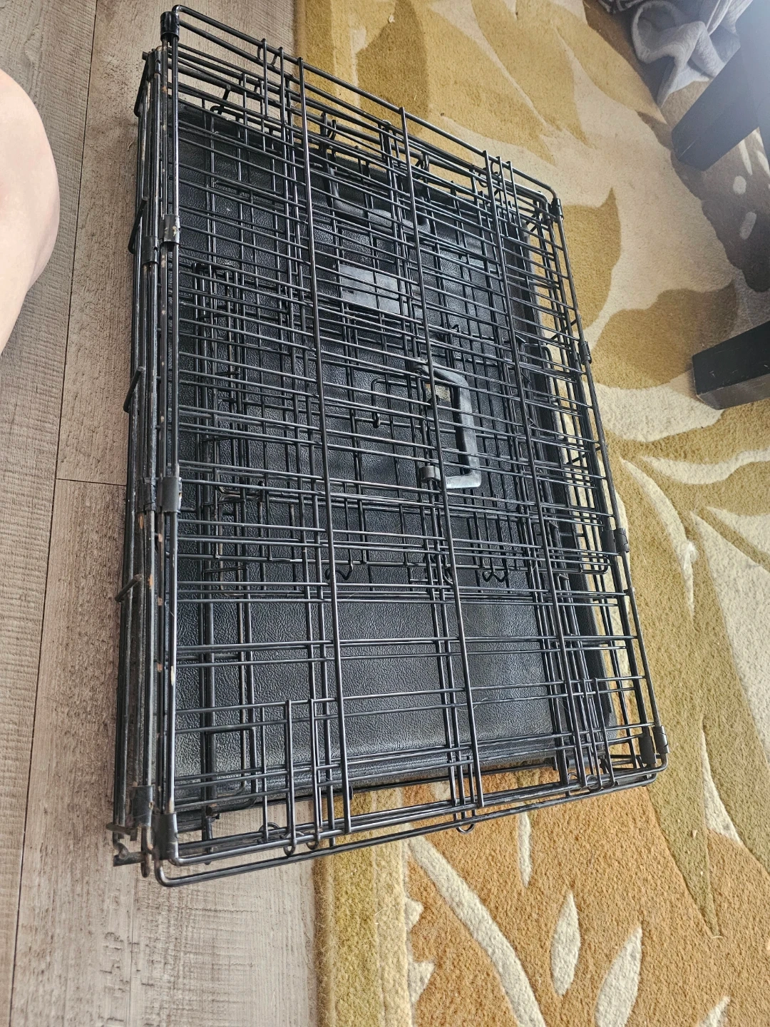 This is a standard black metal dog crate. It includes a black plastic tray at the bottom. It folds flat for easy storage. Great for training or travel!
