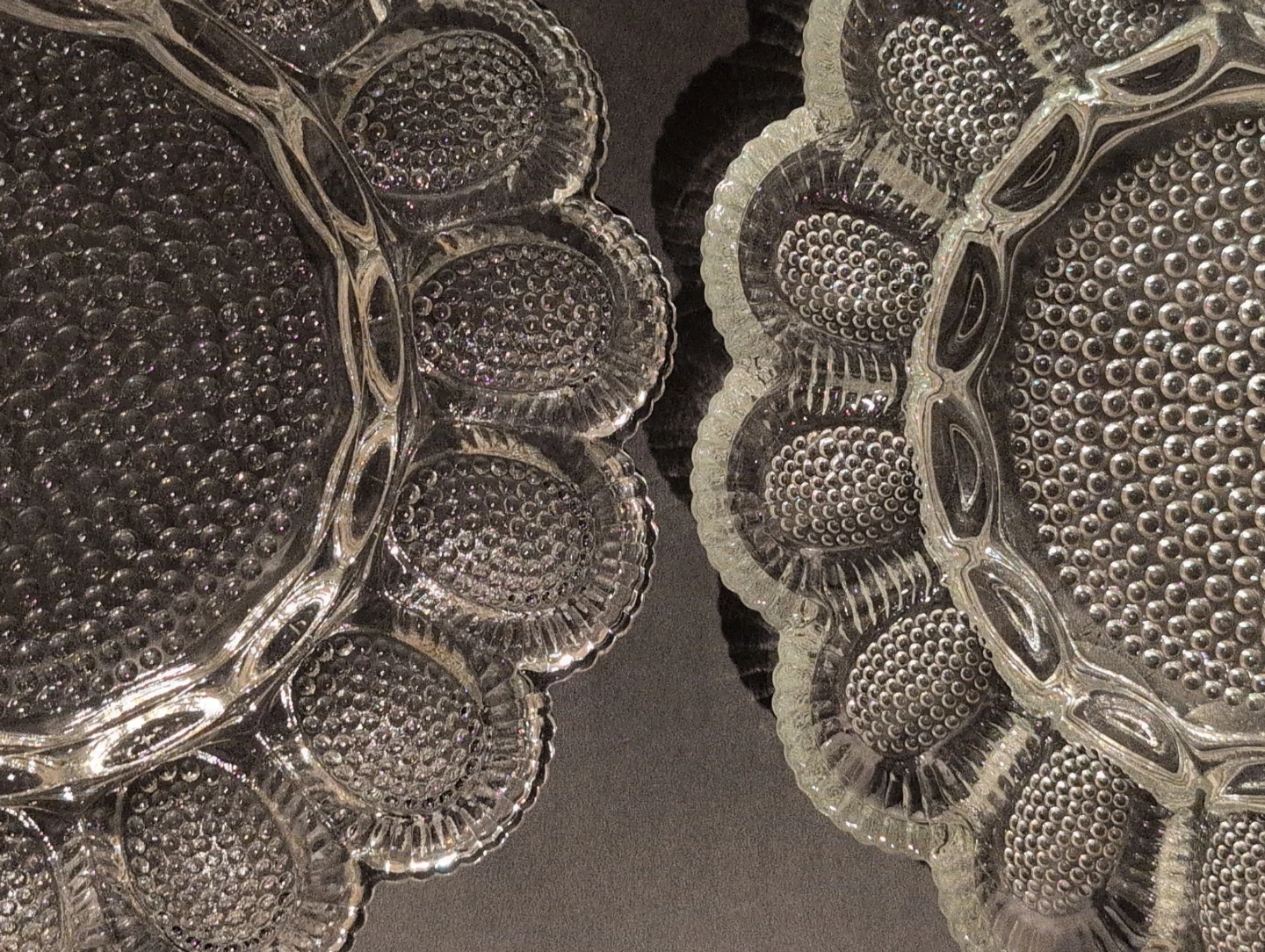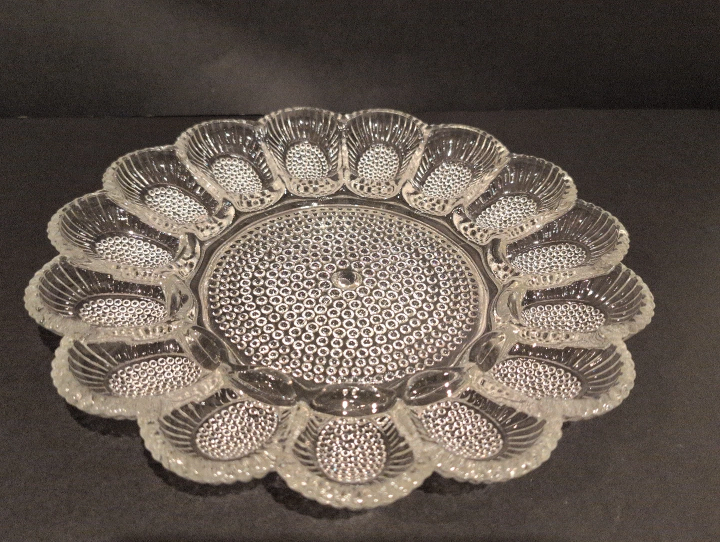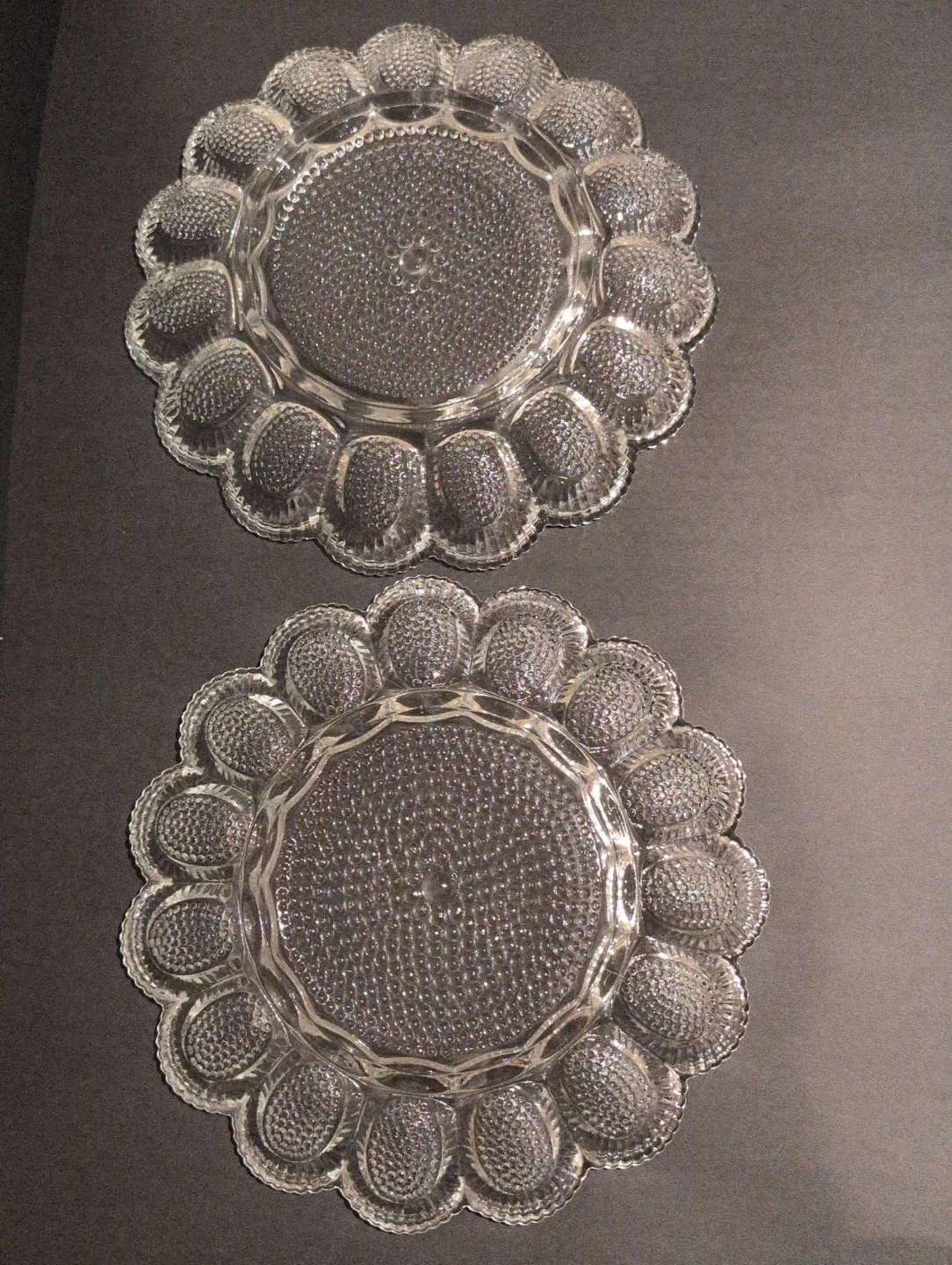 Selling a set of two vintage clear Indiana Glass egg plates. They have a lovely hobnail pattern and are perfect for serving deviled eggs or as a decorative piece for your kitchen. They are in great condition and ready for a new home! 11 1/4 inch diameter.