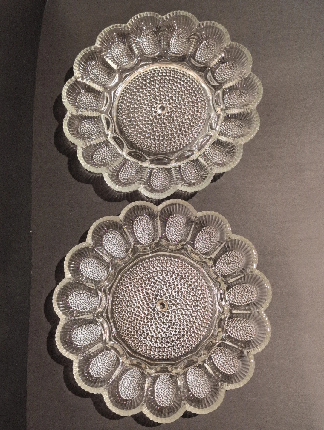 Selling a set of two vintage clear Indiana Glass egg plates. They have a lovely hobnail pattern and are perfect for serving deviled eggs or as a decorative piece for your kitchen. They are in great condition and ready for a new home! 11 1/4 inch diameter.