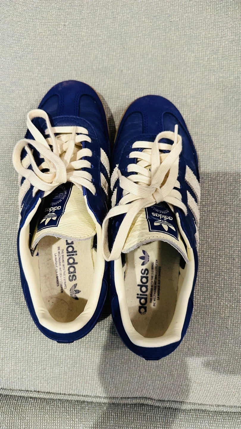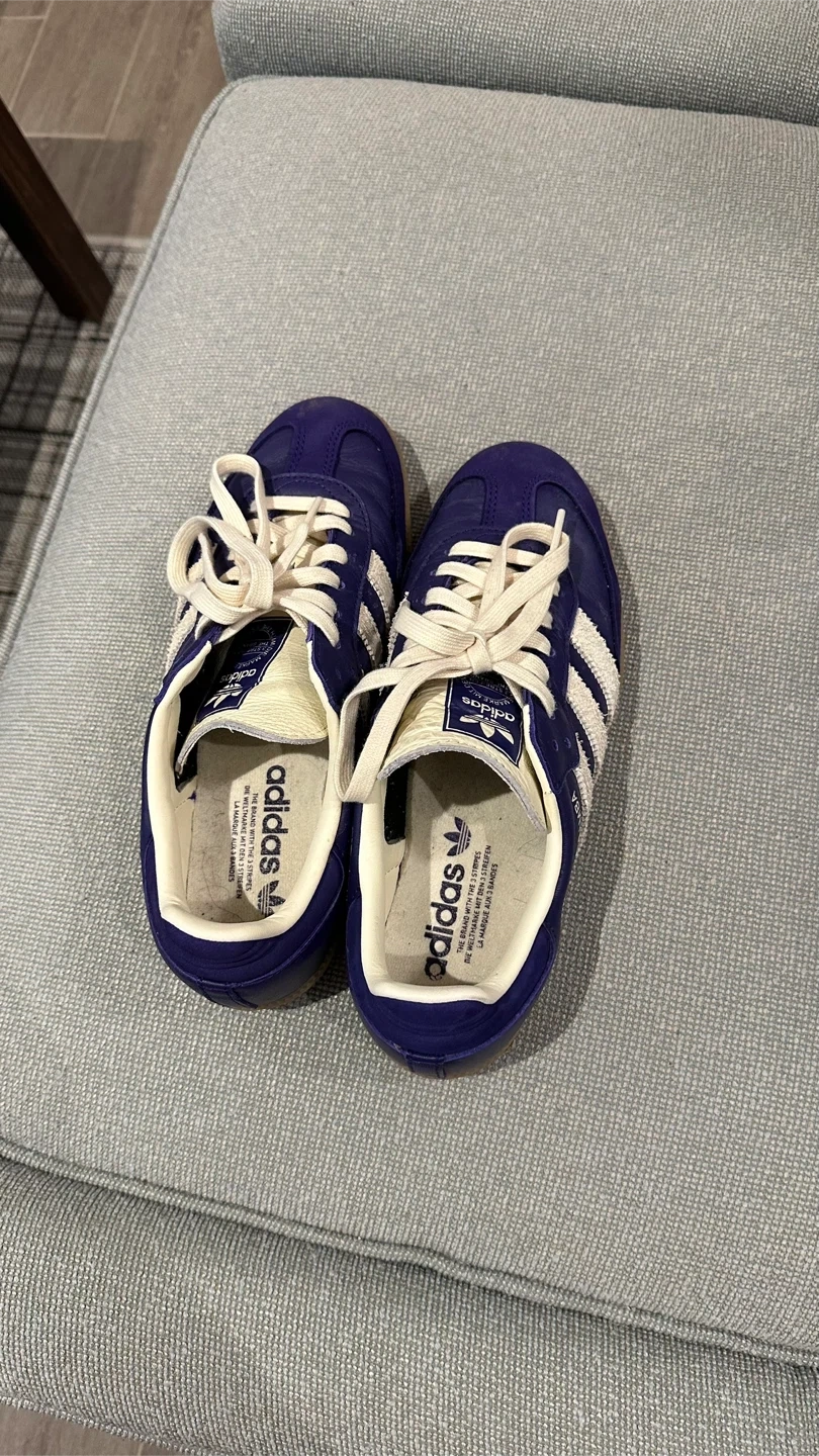 Selling a pair of Adidas Samba sneakers in purple with white stripes. They are in used condition. The size is US 8.