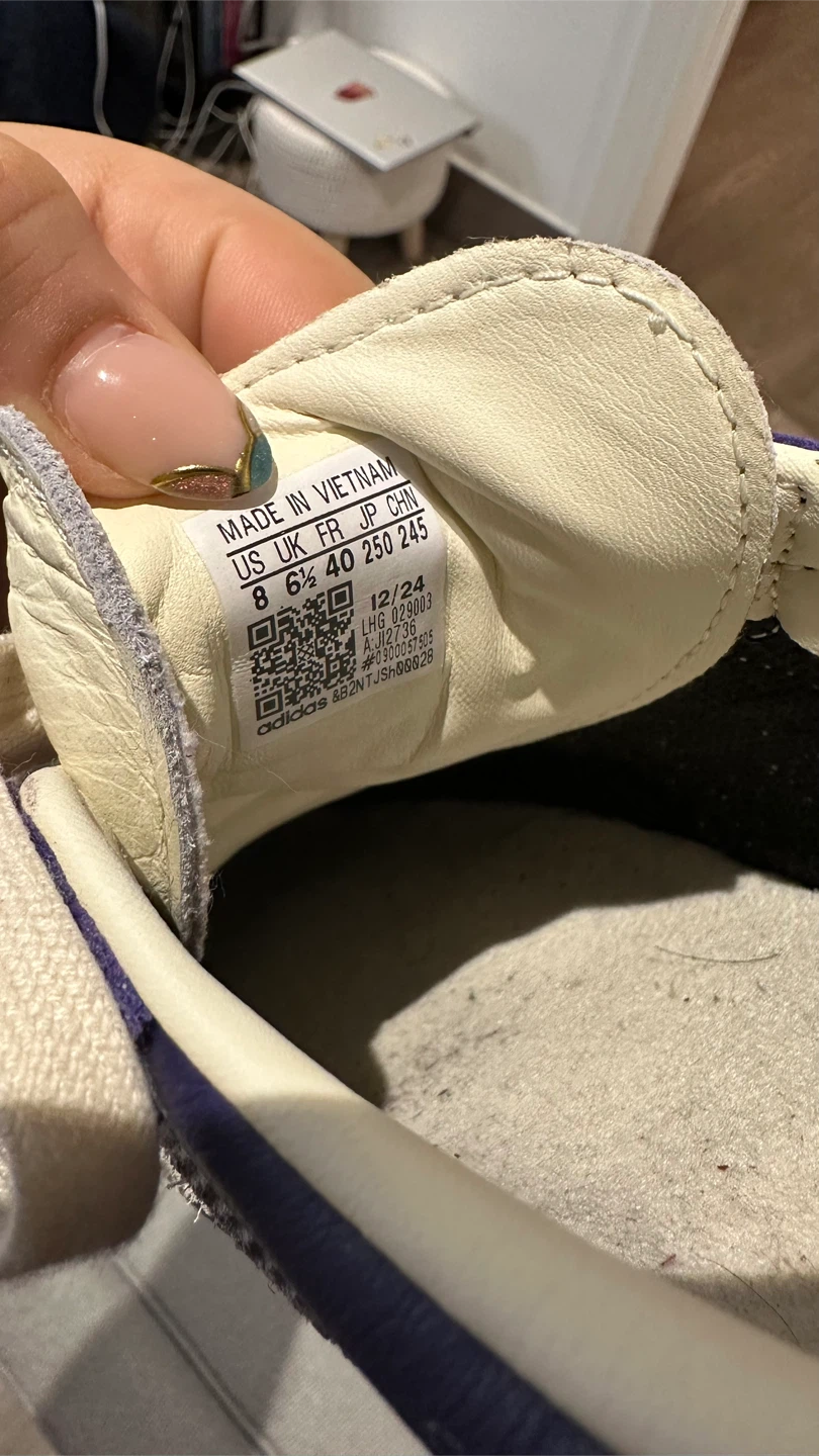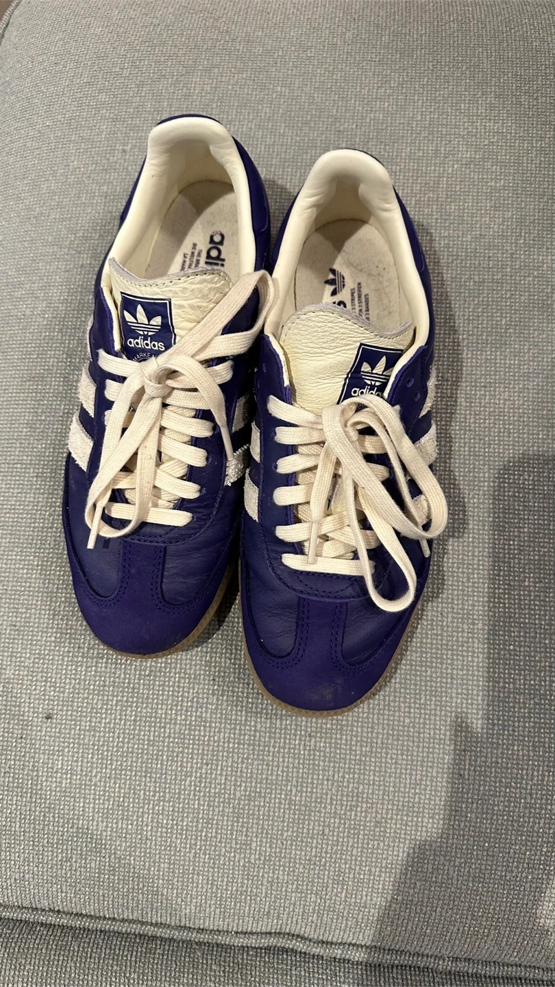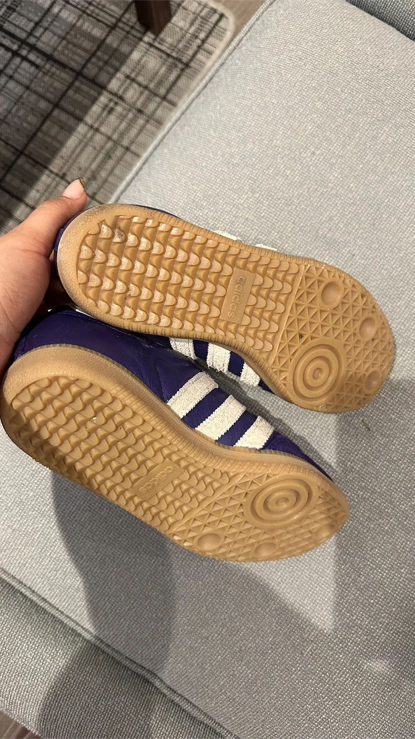 Selling a pair of Adidas Samba sneakers in purple with white stripes. They are in used condition. The size is US 8.