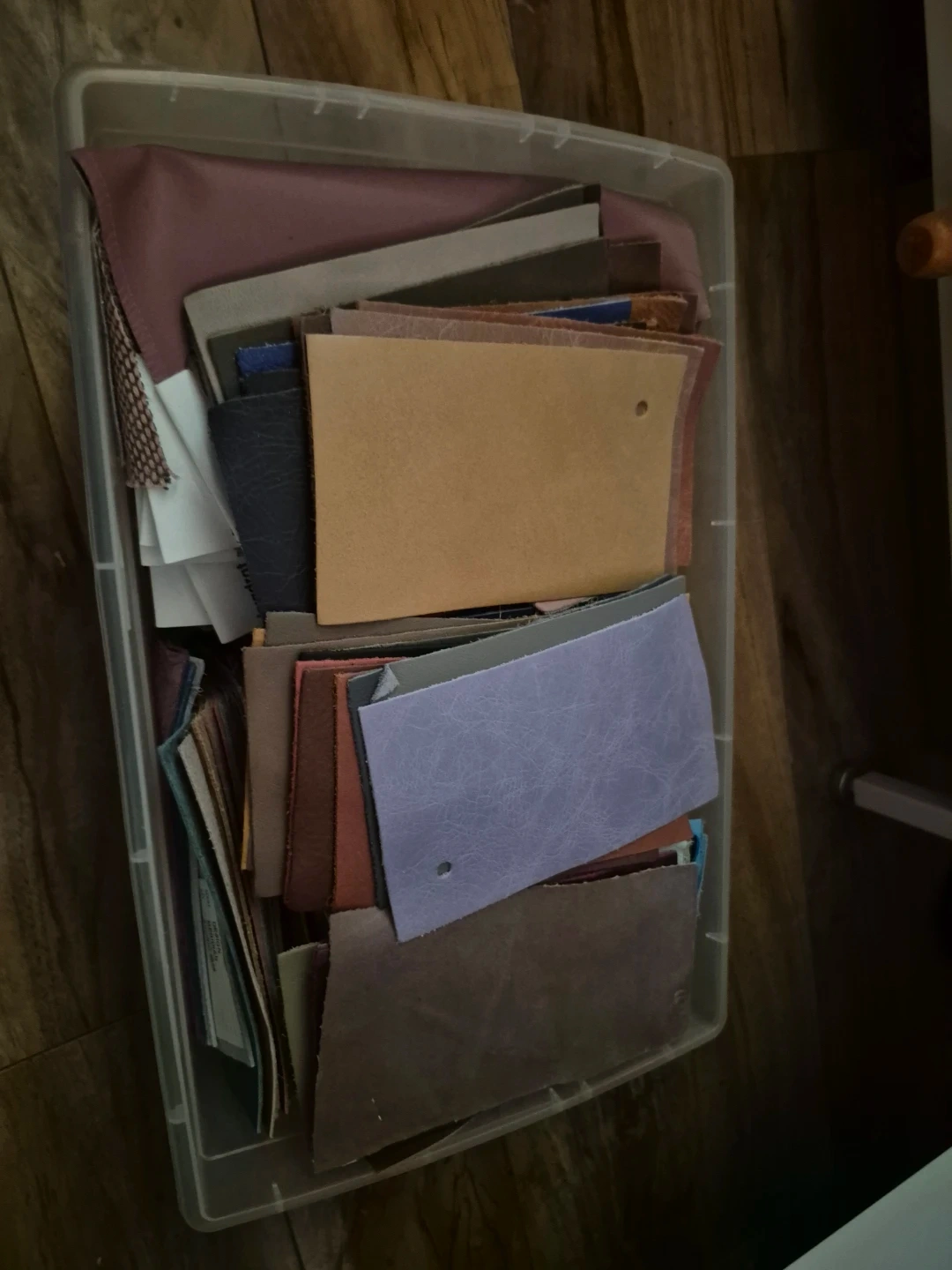 A large collection of fabric swatches in various colours and textures, stored in a clear plastic bin. This assortment includes different materials and shades, perfect for crafting or design projects. The bin helps keep them organized and ready for use!