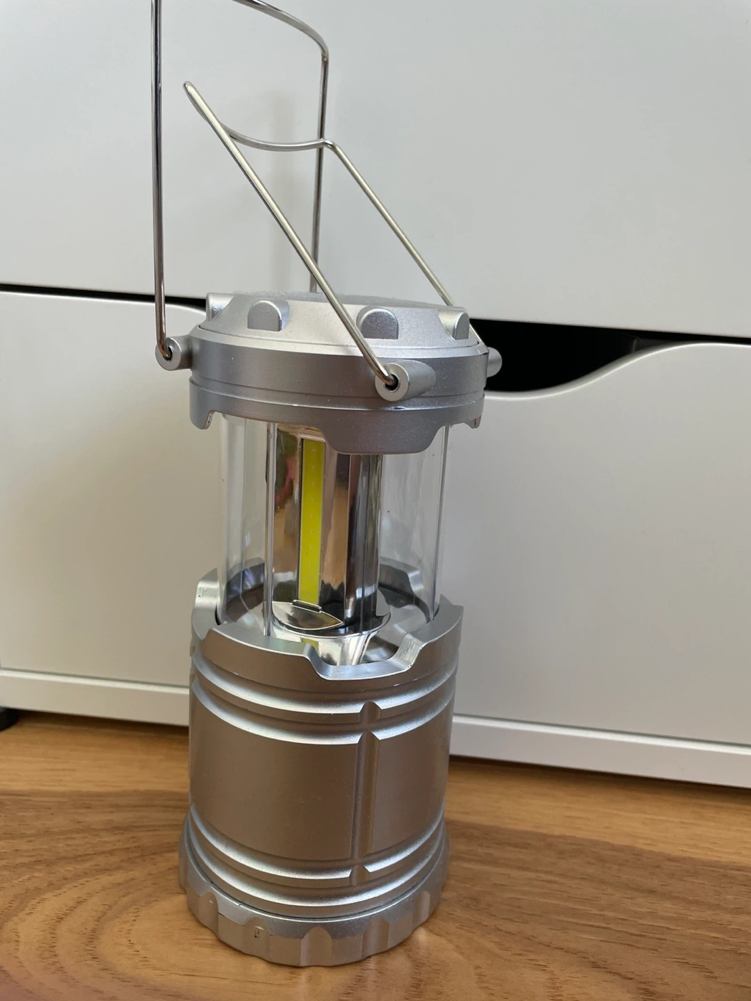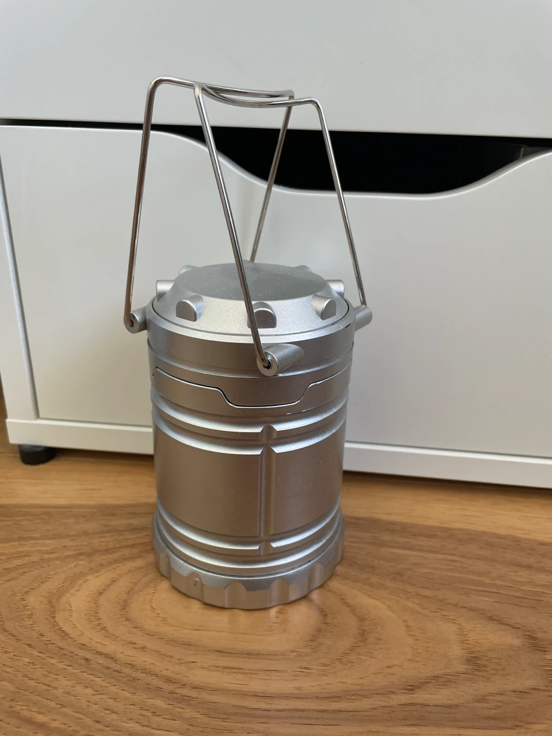 This collapsible camping lantern uses LED technology. It's silver and made of metal and plastic. It's useful for camping or emergency lighting.