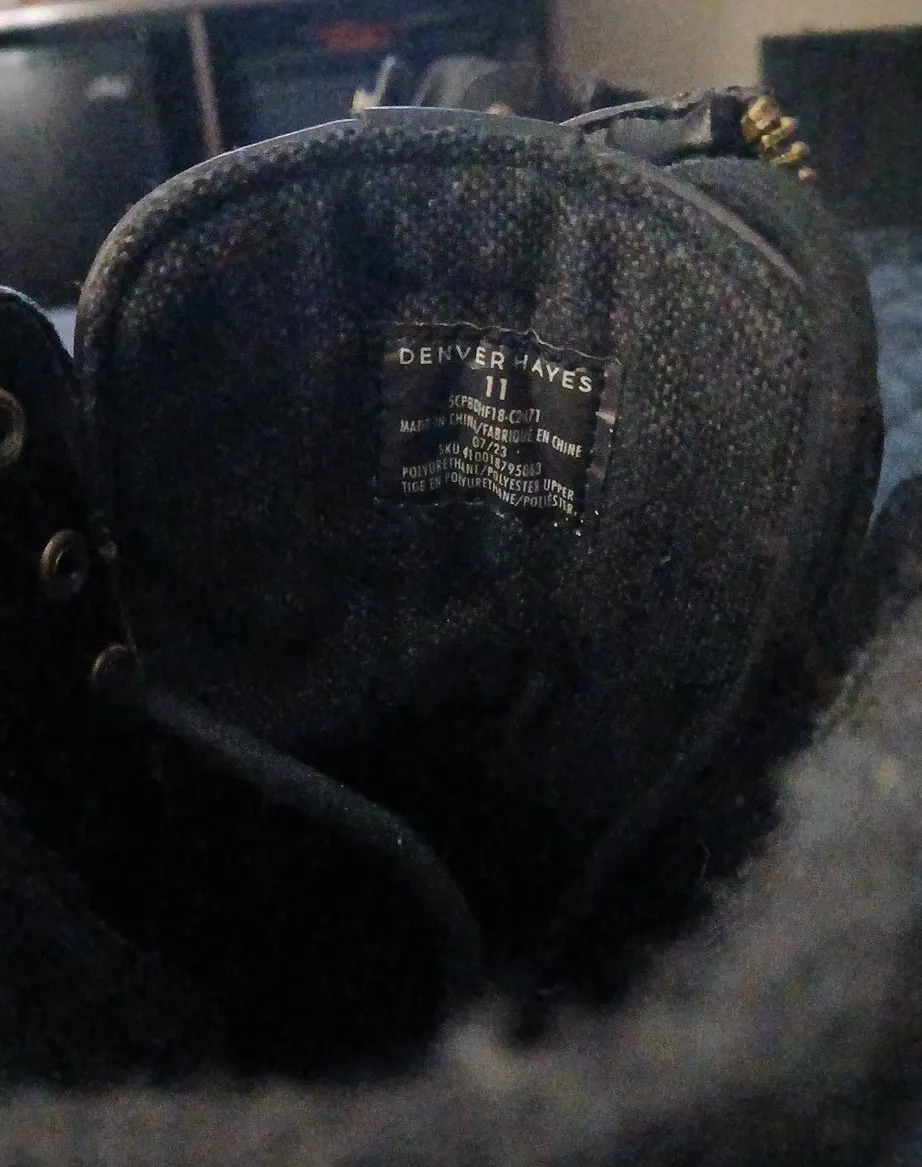 Selling a pair of Denver Hayes boots in size 11. The manufacturing date on the label says July 2023. The upper material is polyurethane and polyester