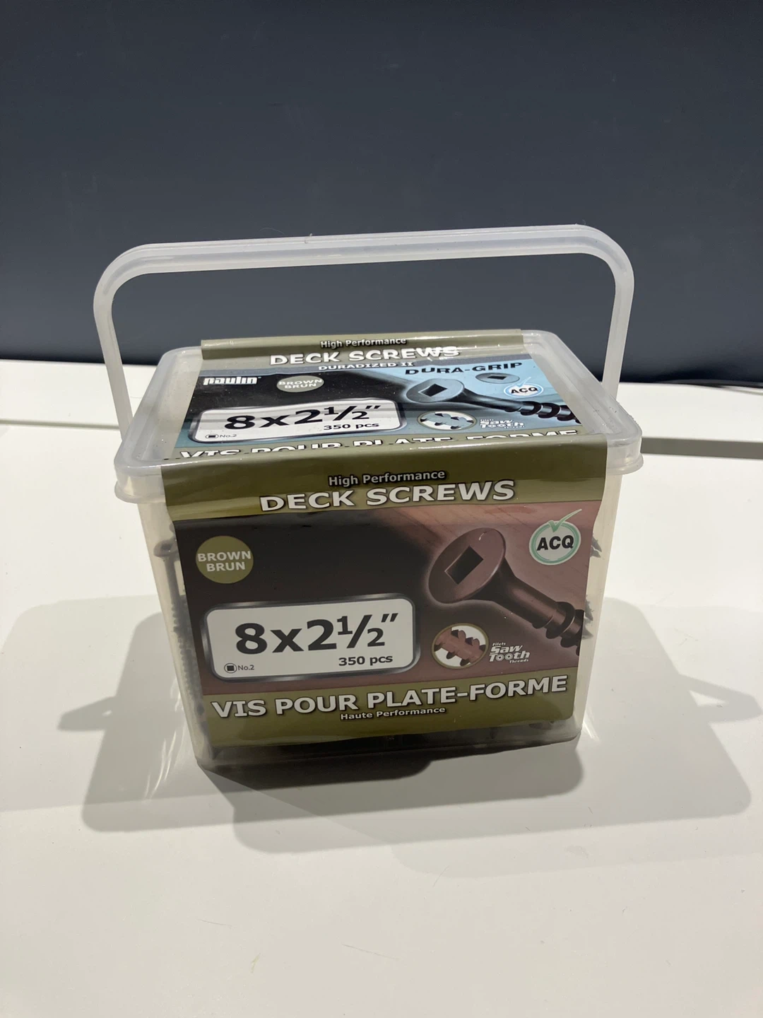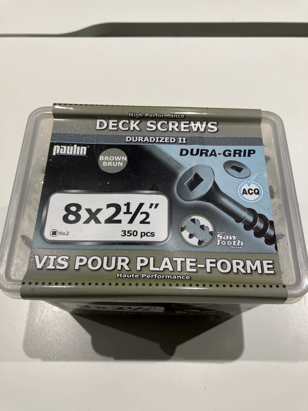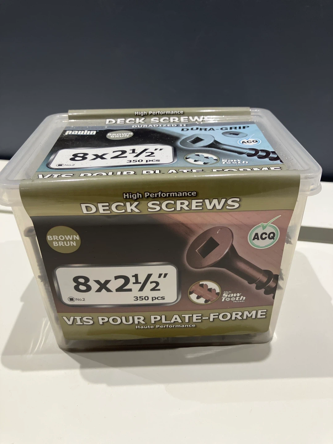 High performance deck screws with Dura-Grip and Dura-sized 8 x 2 1/2 “. Sawtooth threads for faster driving. ACQ approved for treated lumber. 350 pieces included. Brown brun colour.