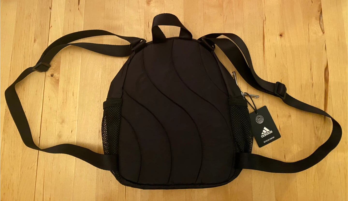 This is an Adidas Linear 3 Mini Backpack in black. It's in great shape and ready for a new adventure! It features the Adidas logo and is made with recycled content.