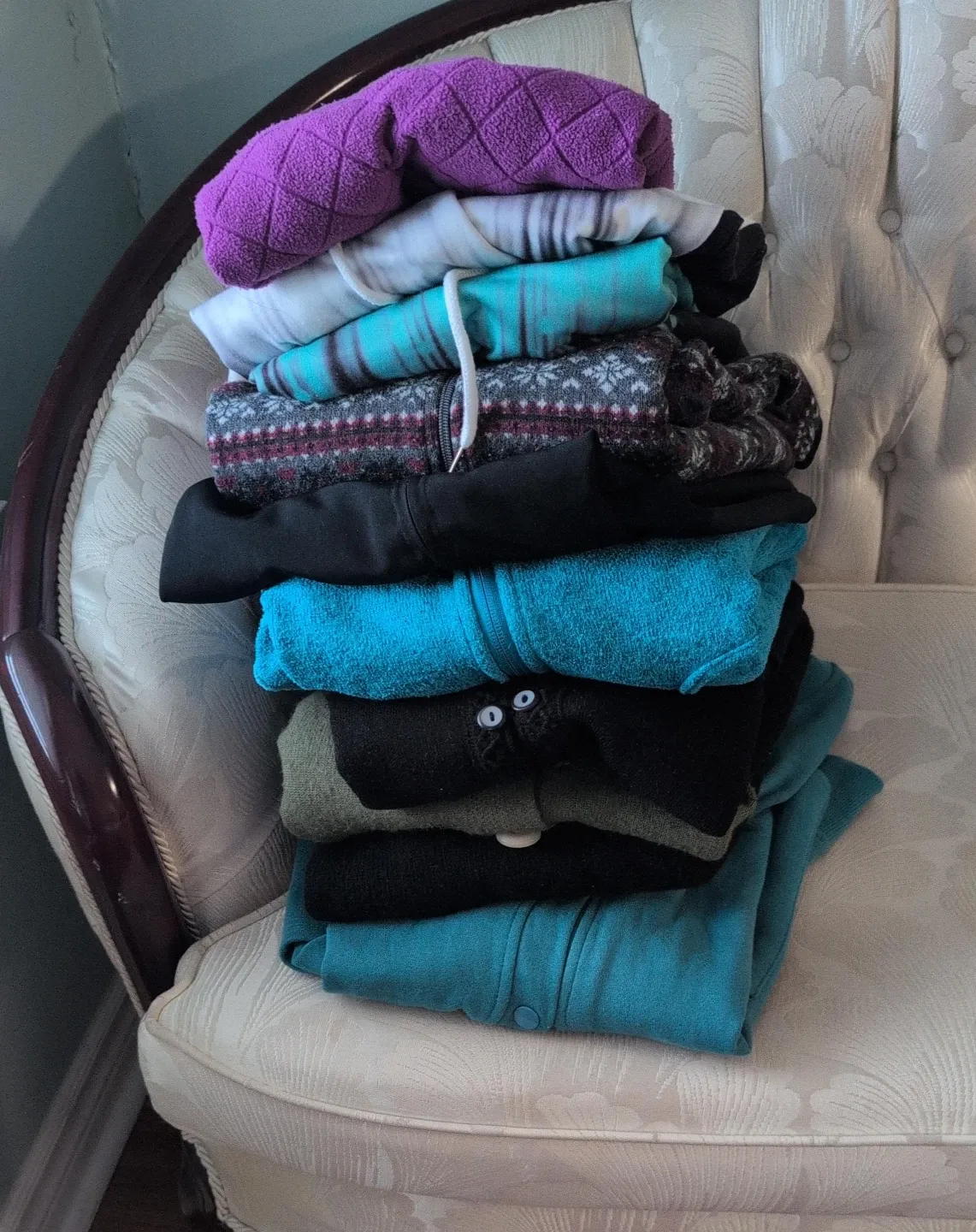 This is a bundle of assorted women's zip-up jackets and sweaters. It includes a variety of colours and patterns. Items are suitable for casual wear or layering.
