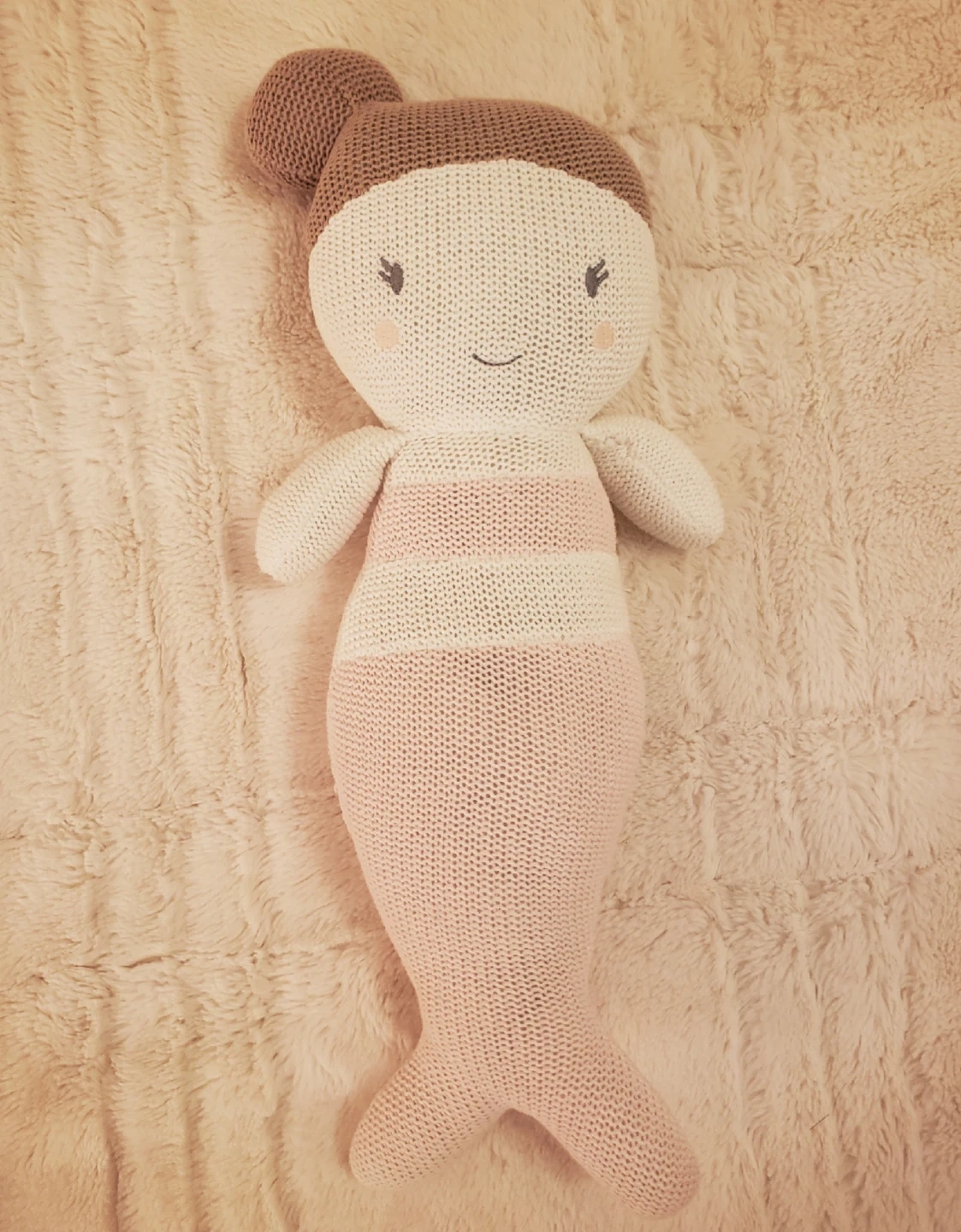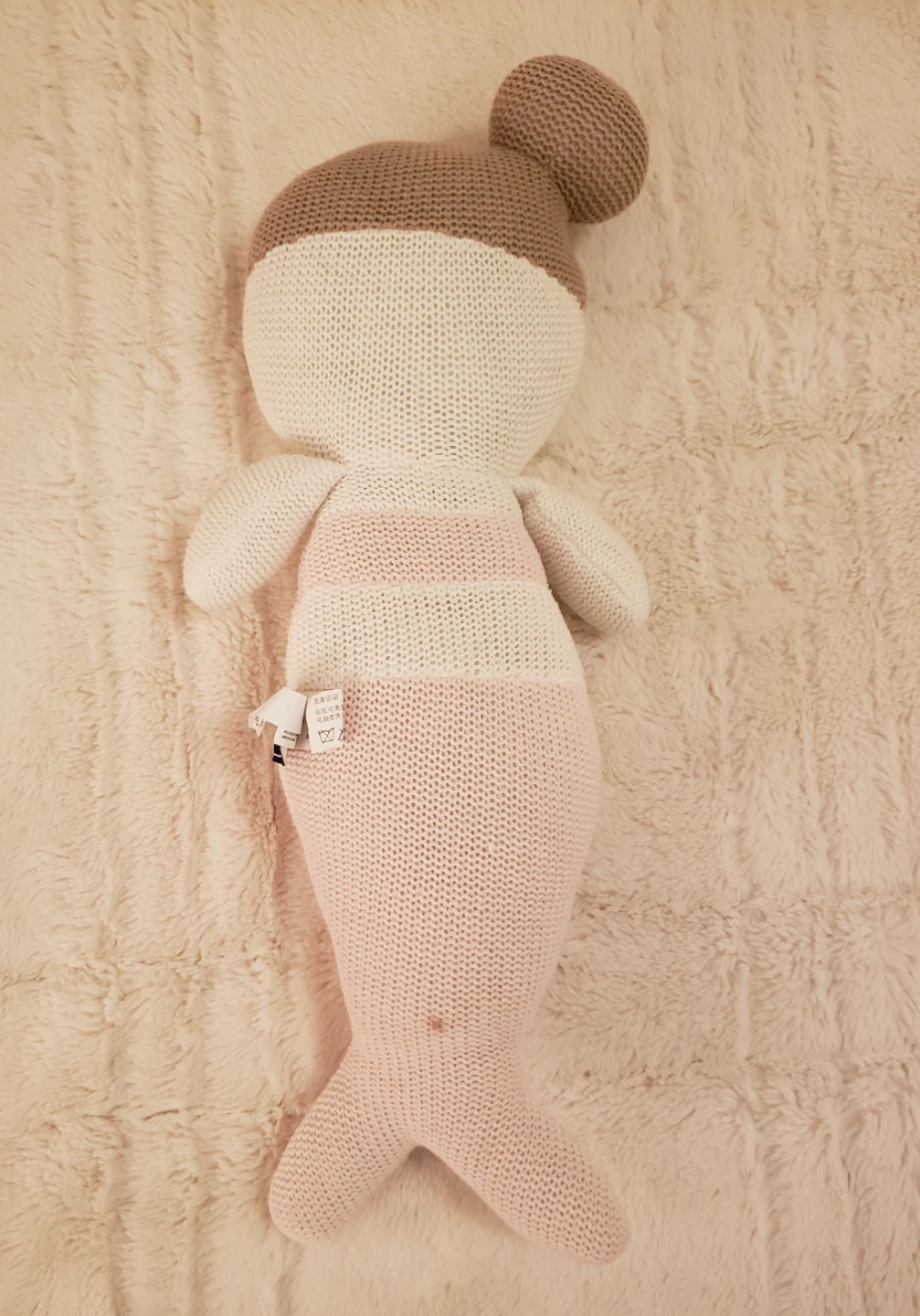 Selling a Cuddle + Kind mermaid doll! It has a little stain on the back but can probably be washed off. It is made out of 100% cotten and has a rattle.