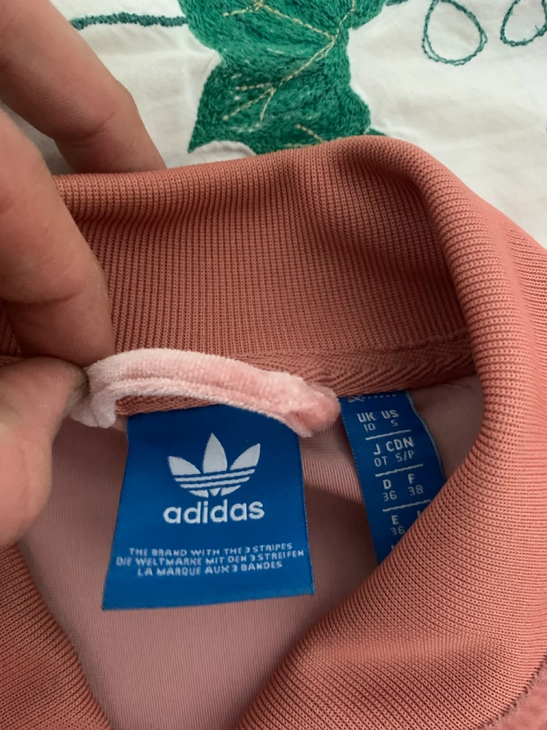 This is an Adidas Originals track jacket. It's made of a soft velvet material and features the iconic three stripes. It's a rose colour and has a full zip closure with pockets.