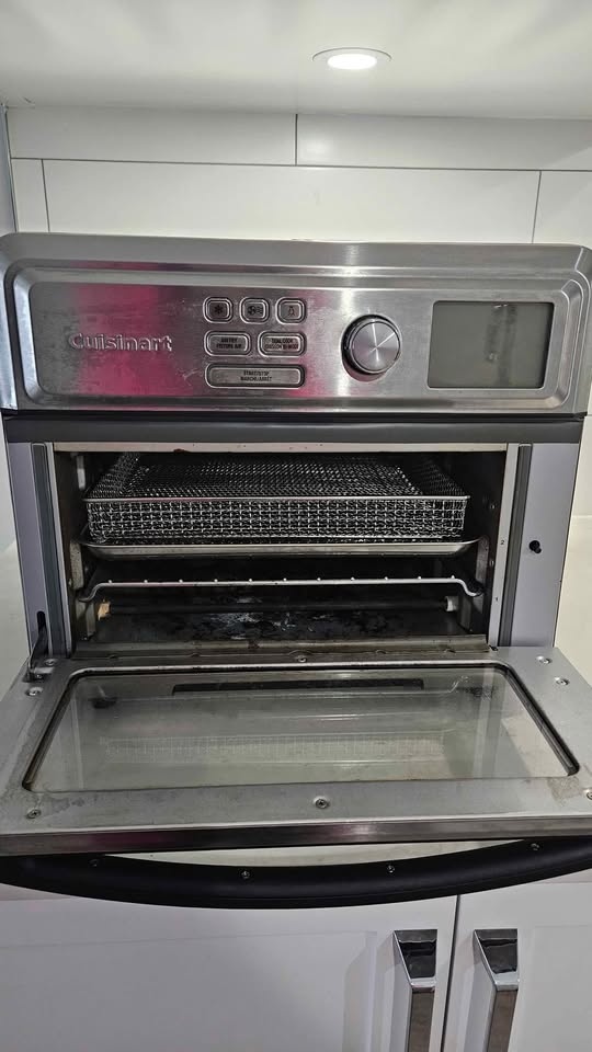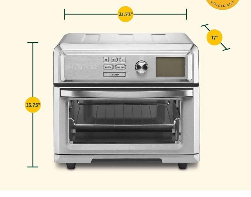 This premium 1800 watt toaster oven and AirFryer has endless functions including AirFry, bake, broil, toast, bagel, pizza, roast, dehydrate, proof, low, dual cook, reheat, and warm with a wide temperature range (Warm-450°F). It's large enough to airfry up to 3-pounds, toast 6 bagel halves, roast a 4-pound chicken, or bake a 12-inch pizza. It has a .6-cubic feet interior with a large viewing window and interior light. It is equipped with a low-temperature setting for slow cooking and braising, plus dedicated functions for dehydrating and proofing. The fan and heater deliver high-velocity, high-heat airflow for perfectly fried results with minimal noise. Includes an oven light, oven rack, dishwasher-safe baking pan, and AirFry basket. The nonstick interior makes cleanup simple.