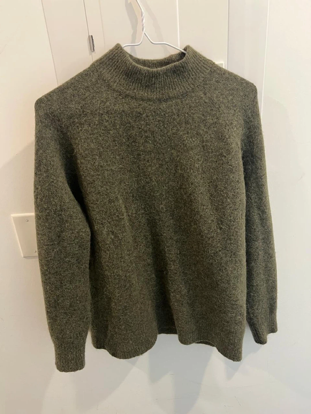 Cozy green mock neck sweater. It's made from a soft wool blend. Great for staying warm during cooler weather!