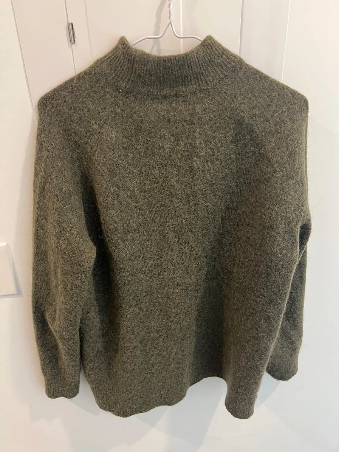 Cozy green mock neck sweater. It's made from a soft wool blend. Great for staying warm during cooler weather!