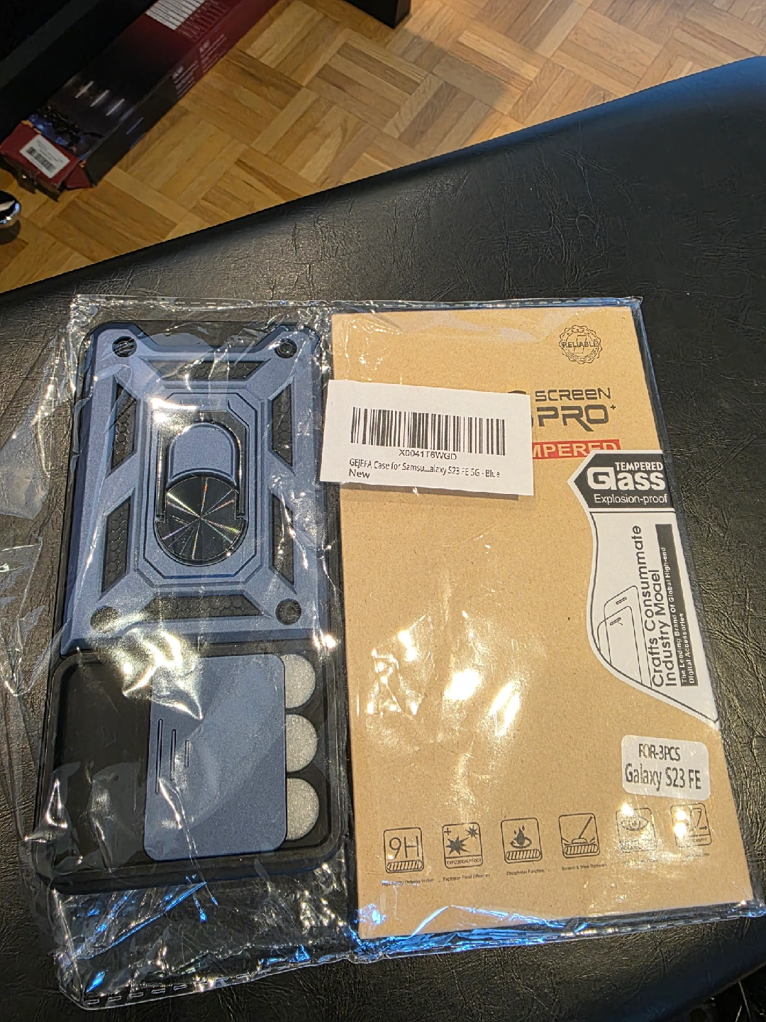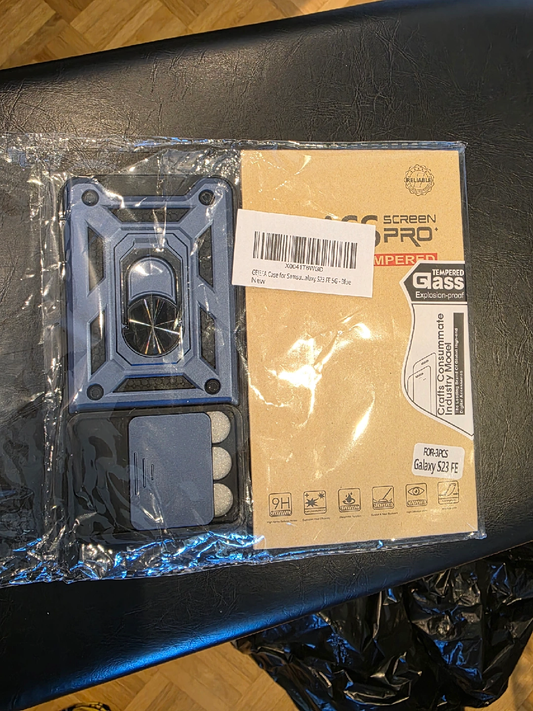 Selling a brand new Qefla case for the Samsung Galaxy S23 FE in blue and black. It also comes with a tempered glass screen protector for extra protection. Never been used!