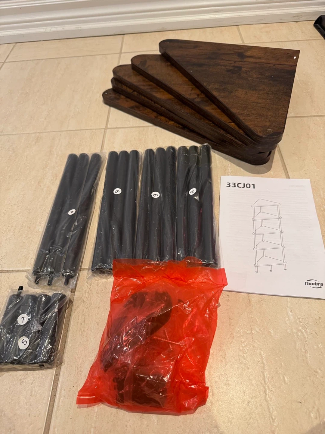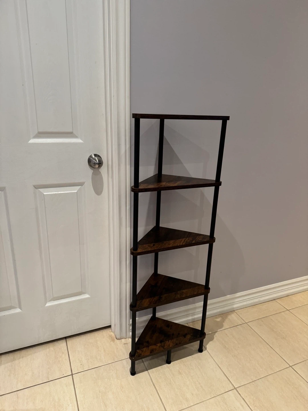 This 5-tier corner shelf unit offers ample storage. It's constructed with a rustic brown finish and black metal legs. This unit is great for maximizing corner space in any room!