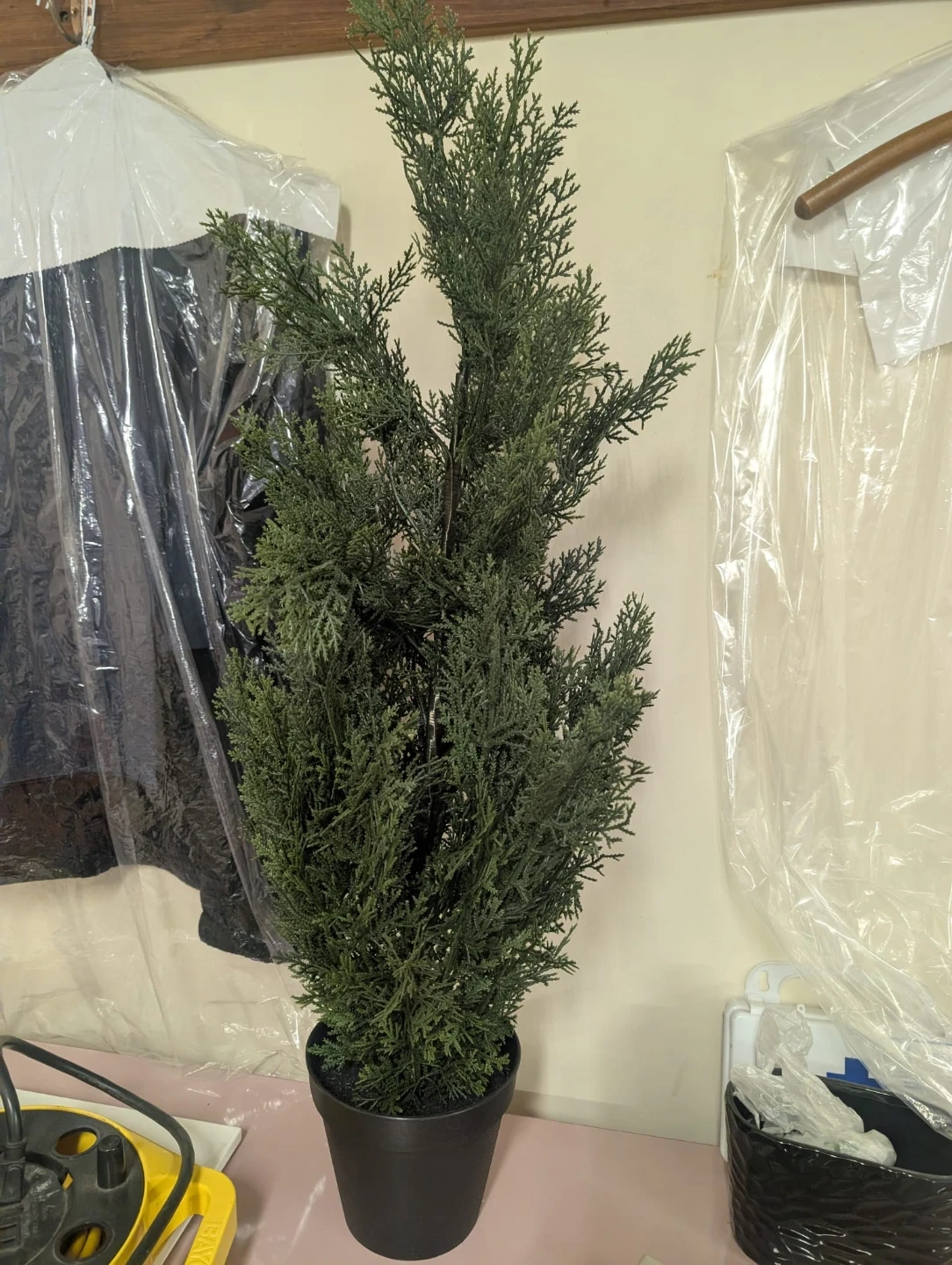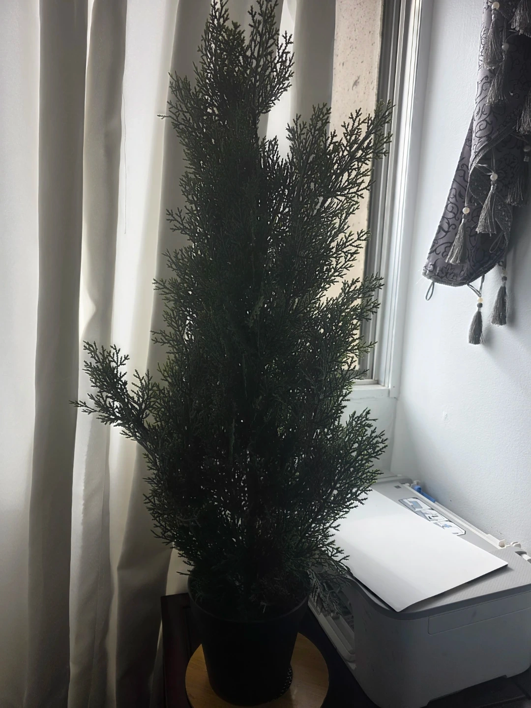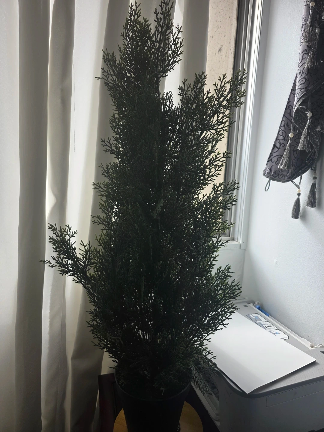 This is an artificial cedar tree, standing tall in a simple black pot. Its realistic foliage adds a touch of greenery without the upkeep. It's a nice accent piece for any indoor space.