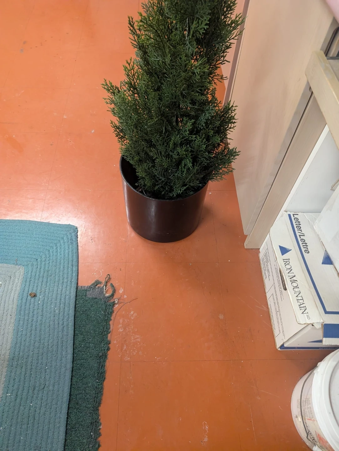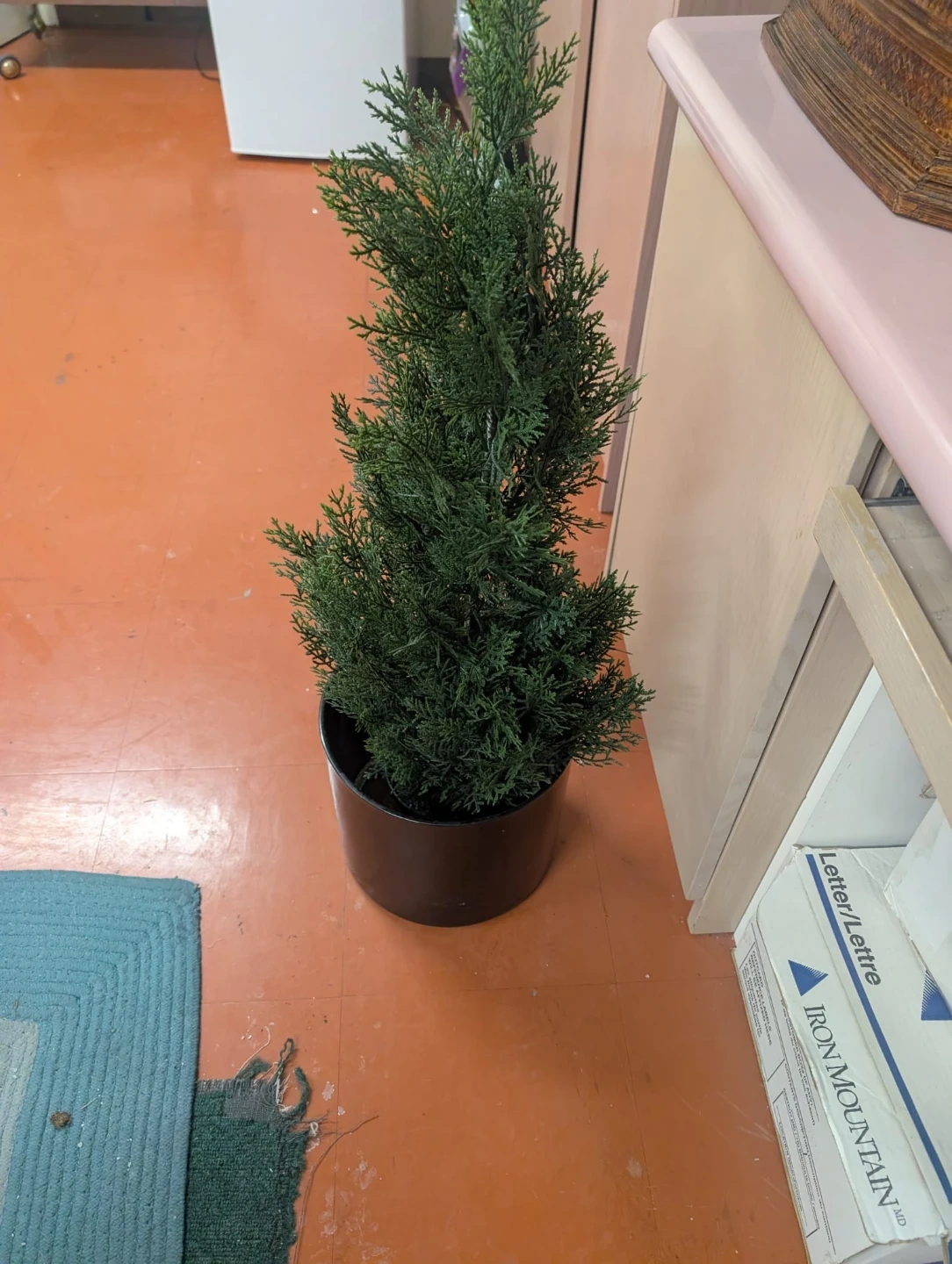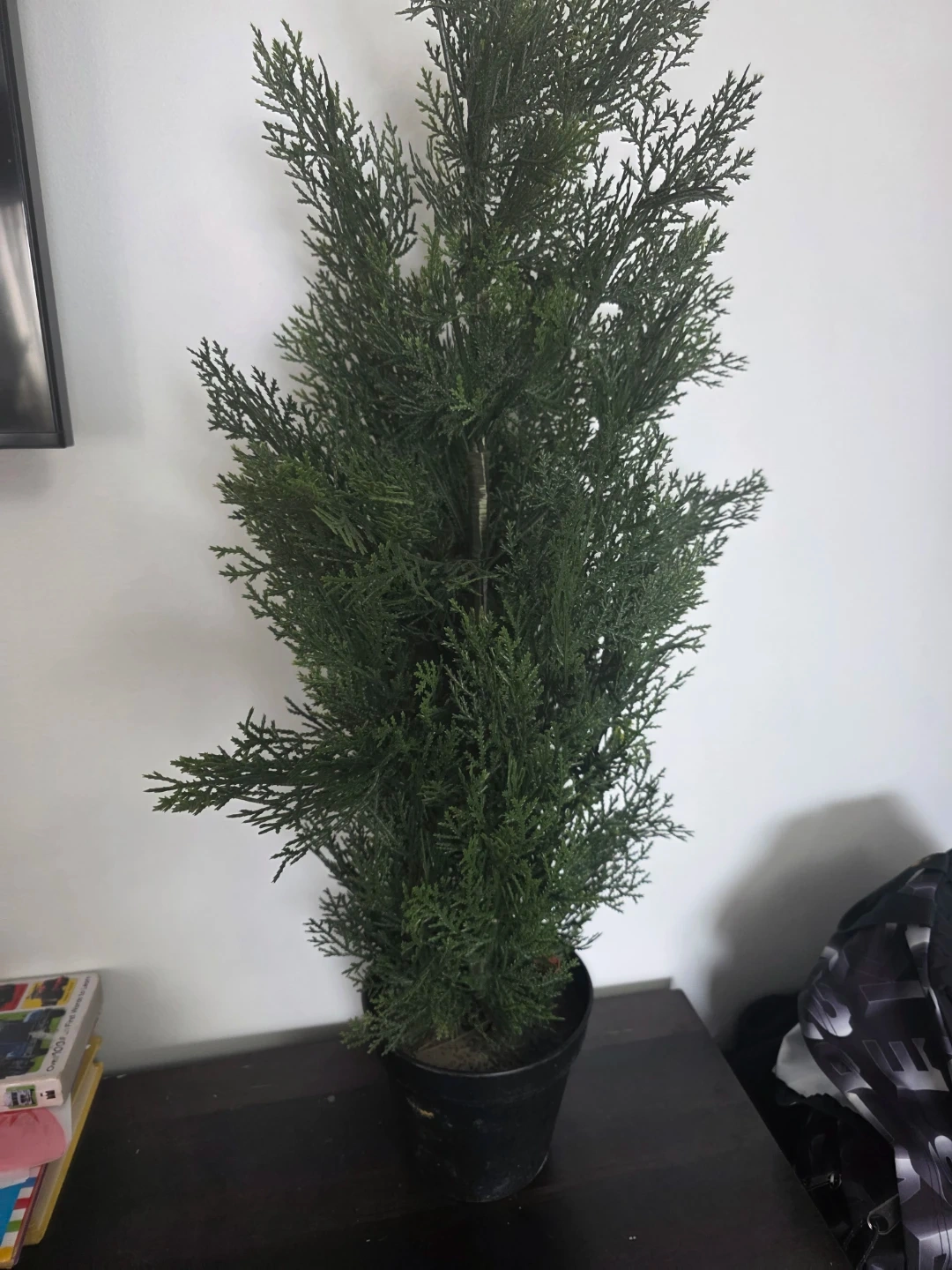 This is an artificial cedar tree, standing tall in a simple black pot. Its realistic foliage adds a touch of greenery without the upkeep. It's a nice accent piece for any indoor space.