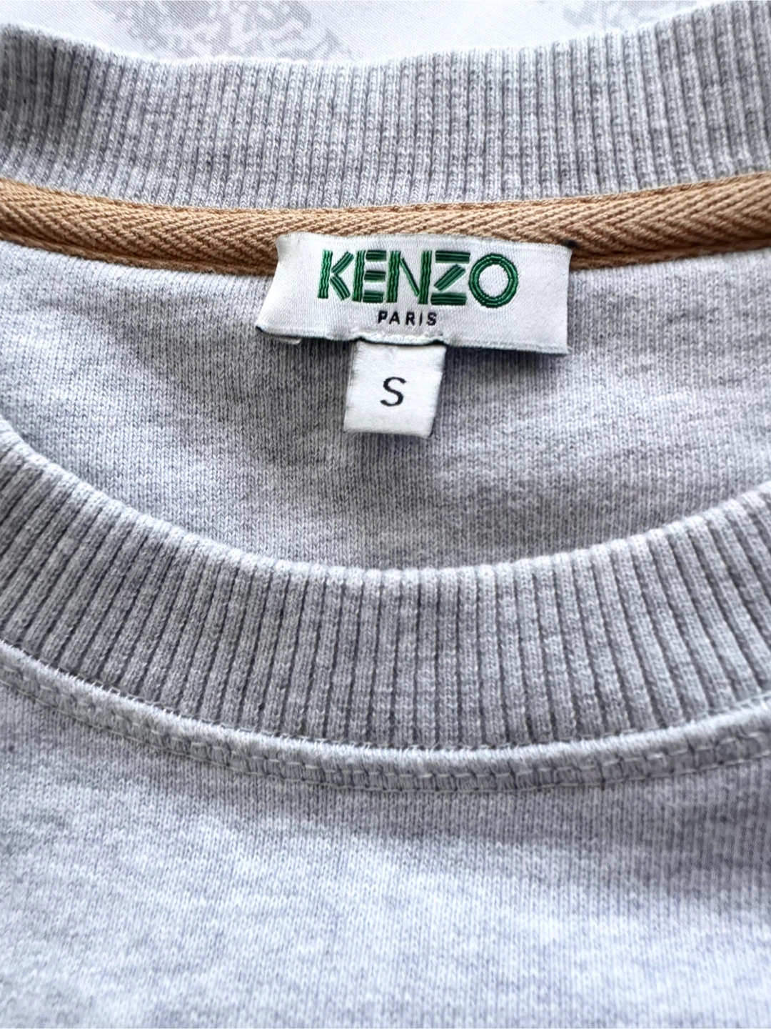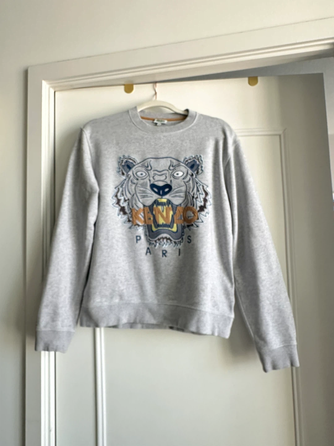 This Kenzo Paris sweatshirt is grey with the iconic tiger graphic. It's a size small. There's a small mark on the sleeve.