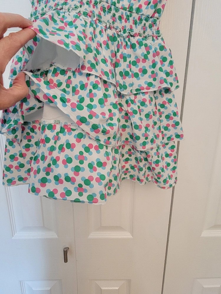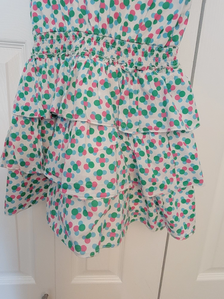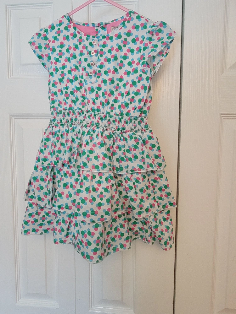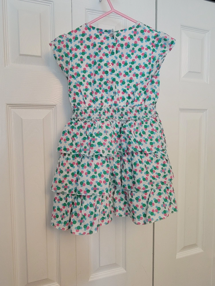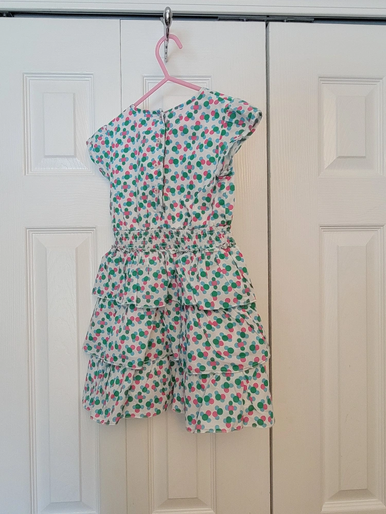 Cute little dress with green, pink and blue polka dots. It has a white background and is a layered dress.