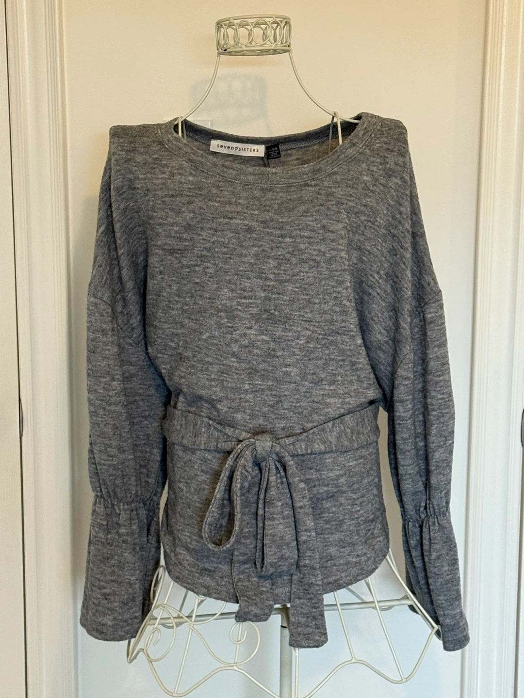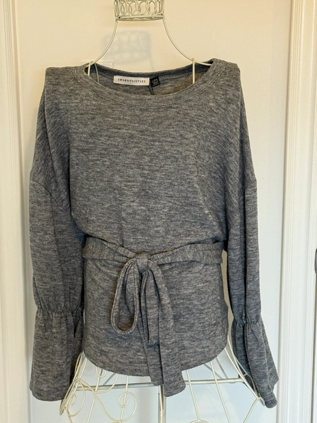 A cute soft and comfy Seven Sisters top! It's a lovely grey colour and features a flattering tie-waist design, and flowy sleeves. Size is large and in great condition!