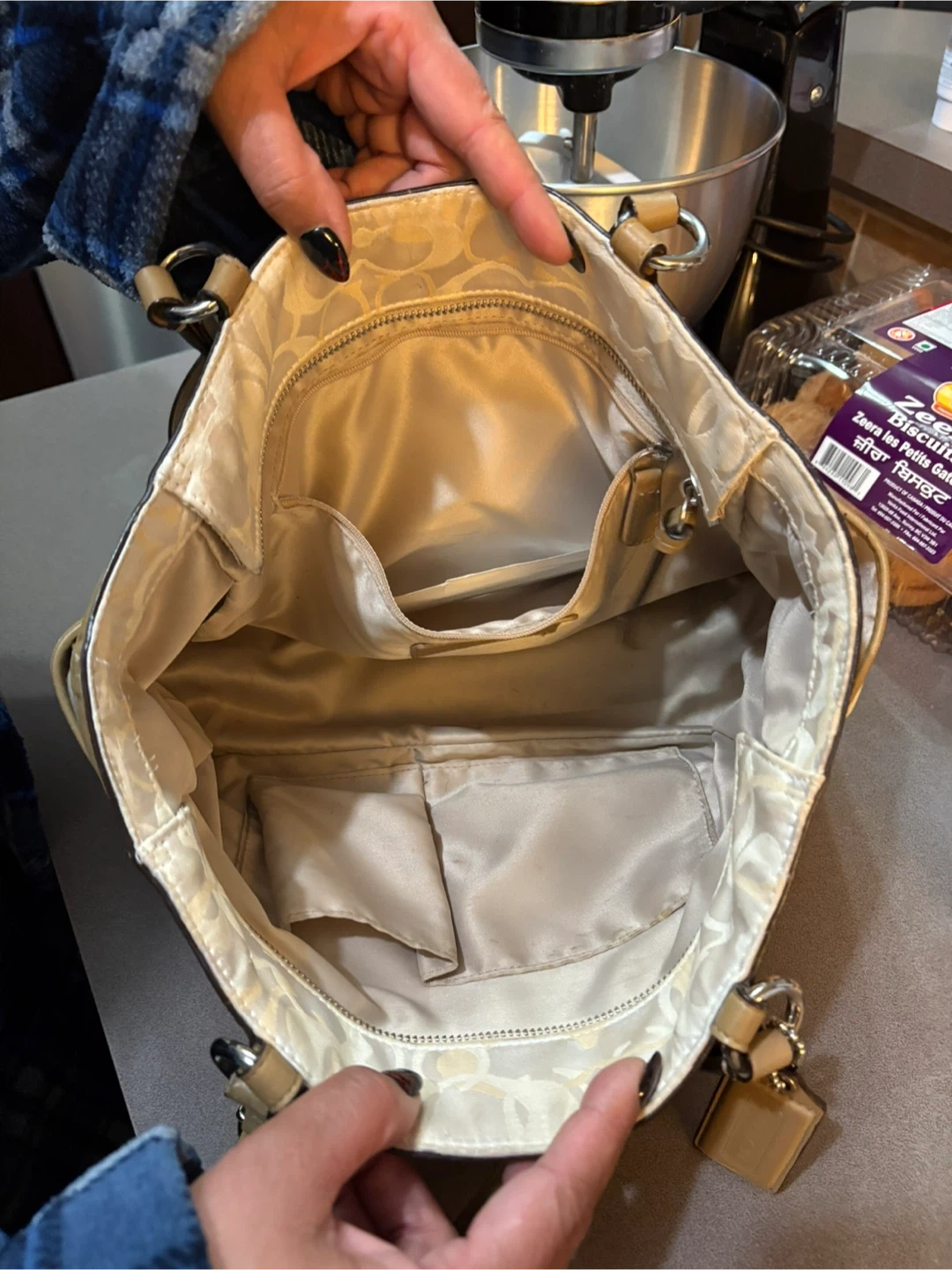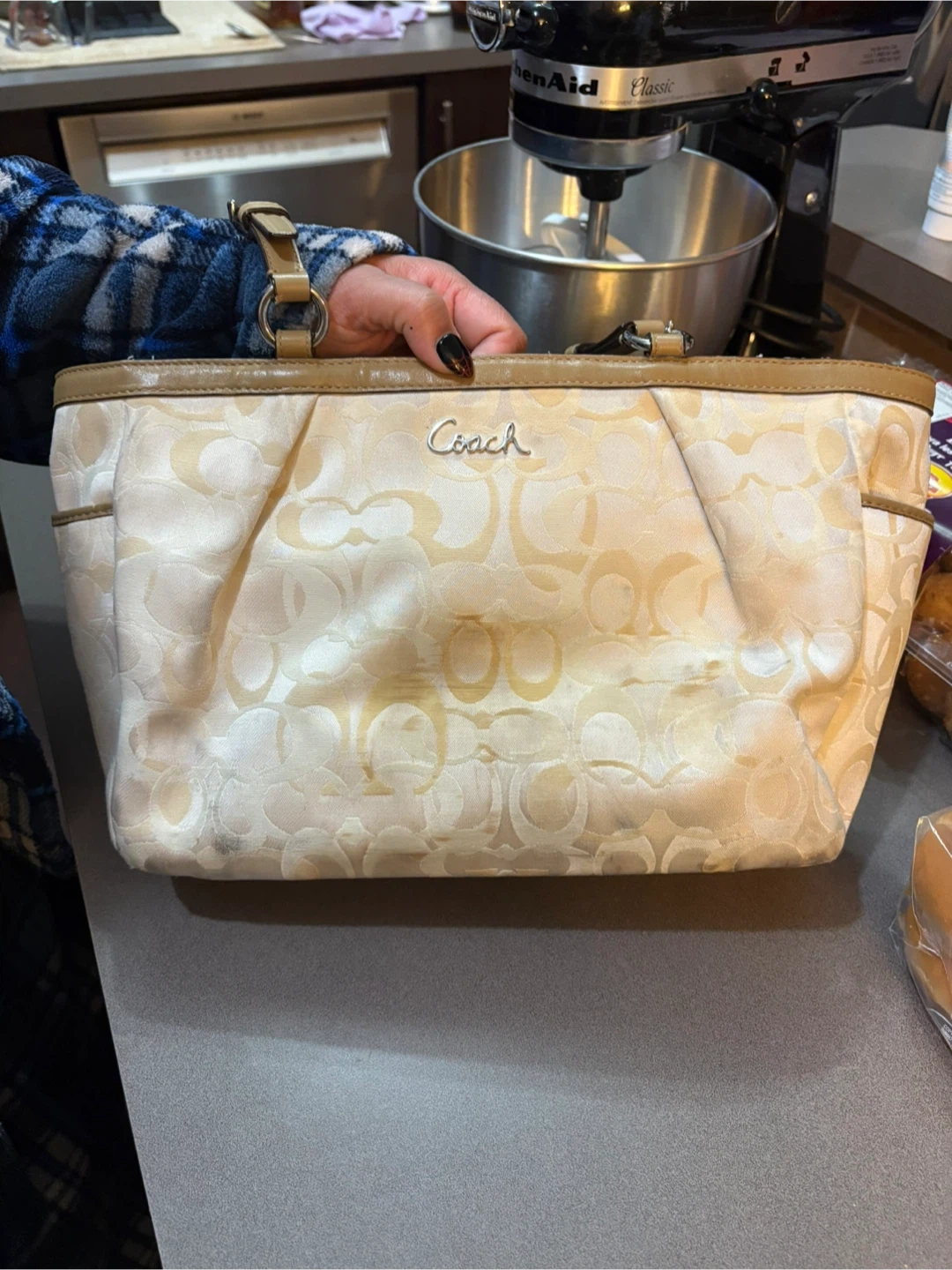 Selling a Coach Signature Collection tote bag! It's made of woven jacquard fabric, specially treated to repel water and stains. It features a sophisticated pattern inspired by graphic elements from Coach archives. The bag has a few signs of use. As is.