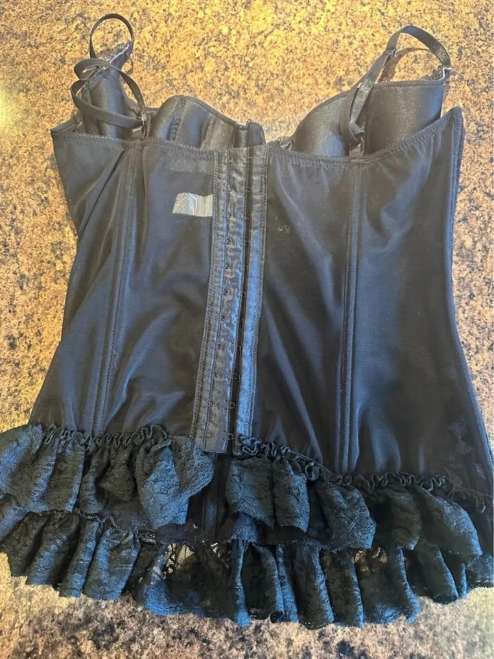 Frederick's of Hollywood black lace bustier, reminiscent of their vintage 1980s and 90s designs.