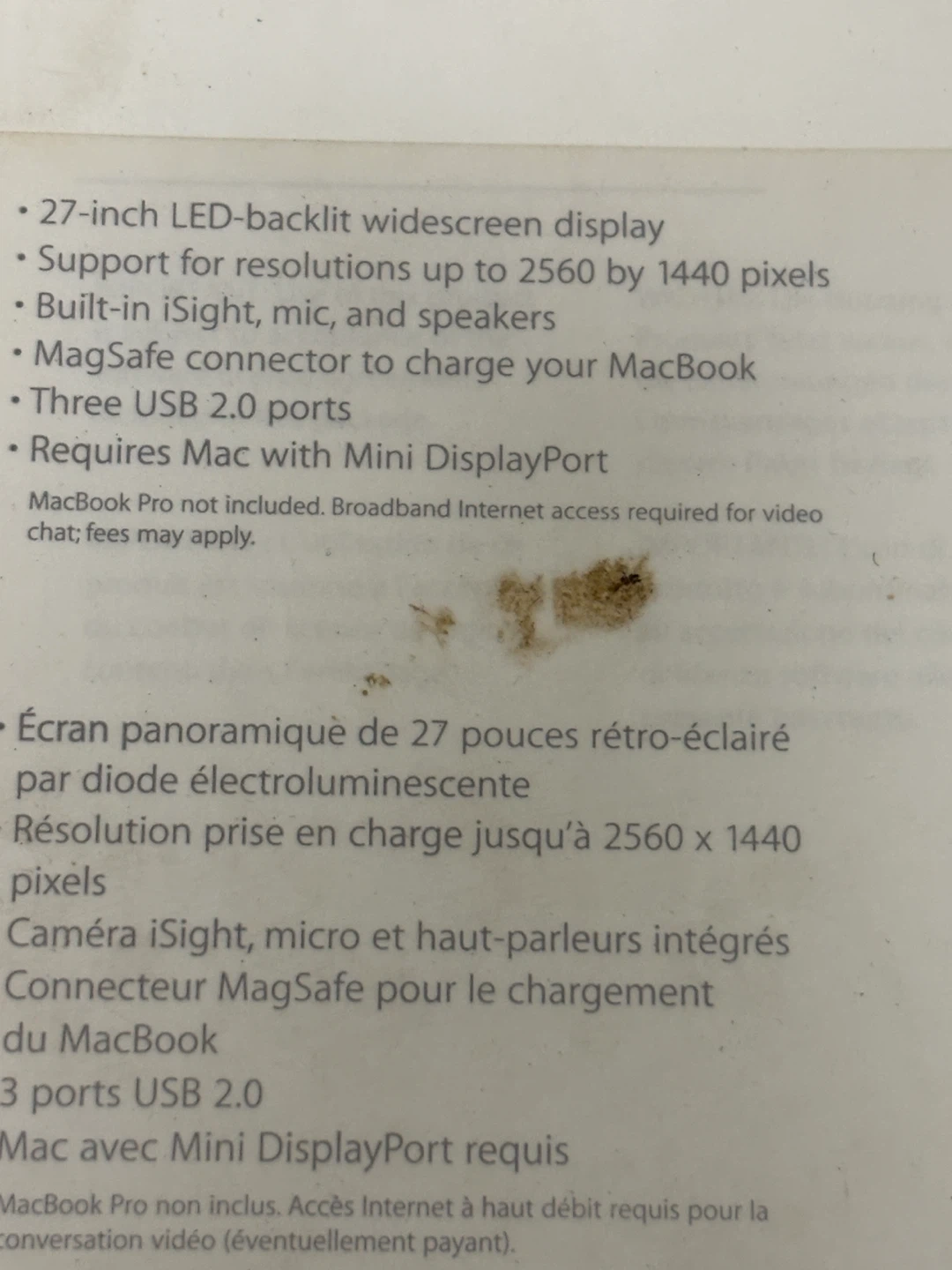 It has a built-in iSight camera, mic, and speakers. It also has a MagSafe connector to charge your MacBook and three USB 2.0 ports. Requires Mac with Mini DisplayPort. Box included.