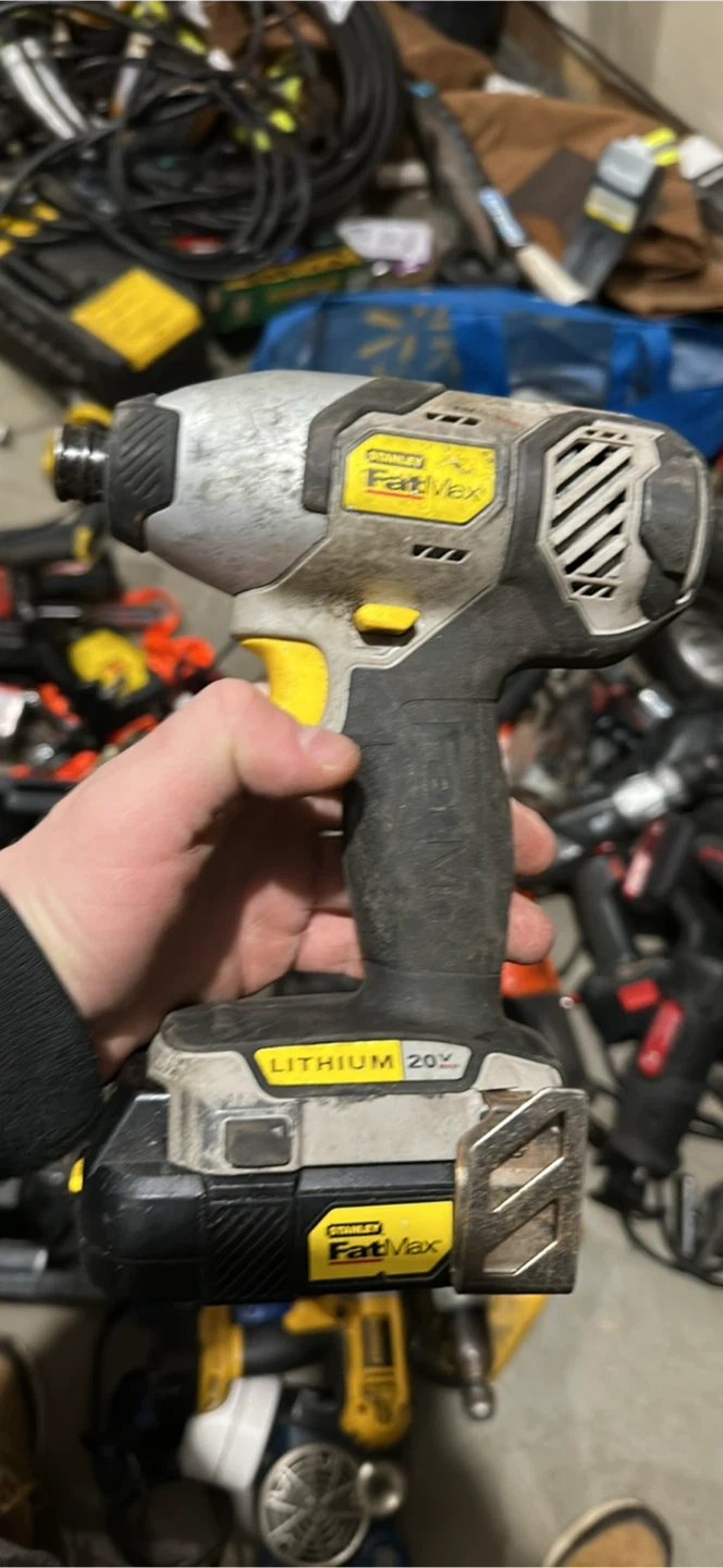 Stanley FatMax 20V Lithium Impact Driver. It's a cordless power tool for driving screws and bolts. Plastic and metal construction. Used condition with some dirt. This driver's great for all your DIY projects!