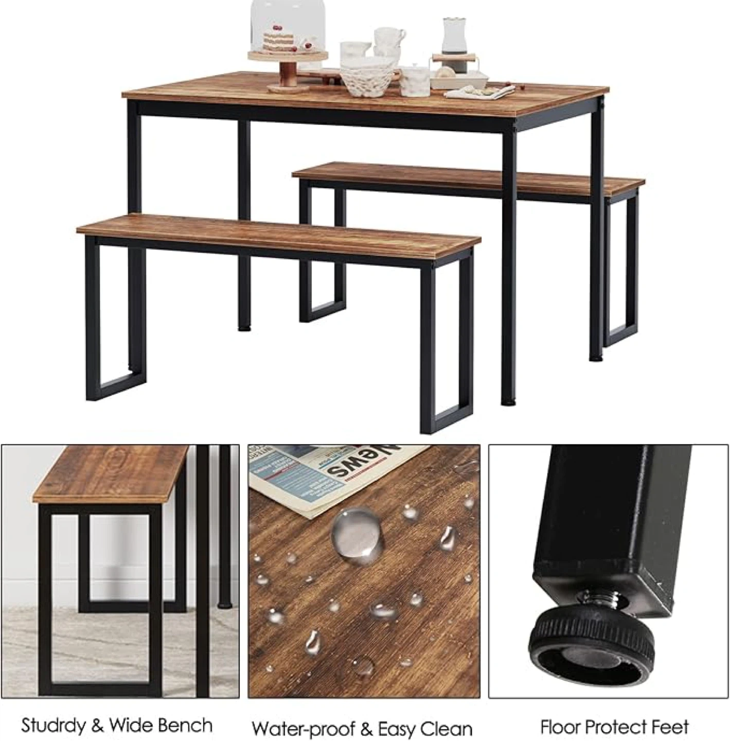 This dining table set includes a table and two benches. The table is 44.9 inches long and 25.6 inches wide, while the benches are 39.4 inches long and 11.8 inches wide. It's a sturdy and wide bench, waterproof and easy to clean, with floor-protecting feet
