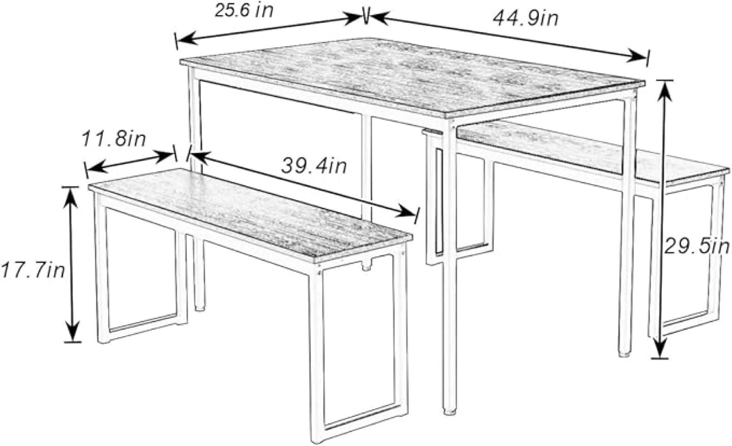 This dining table set includes a table and two benches. The table is 44.9 inches long and 25.6 inches wide, while the benches are 39.4 inches long and 11.8 inches wide. It's a sturdy and wide bench, waterproof and easy to clean, with floor-protecting feet