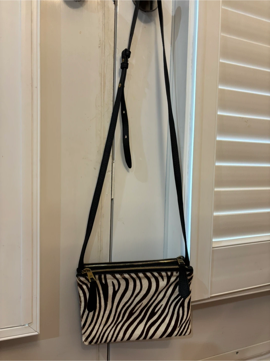 This Banana Republic crossbody bag features a black pebbled leather front and a striking zebra print calf hair panel. It has dual zip top closures and a single adjustable shoulder strap. Made in India, it's 22 x 1.5 x 15 cm.
