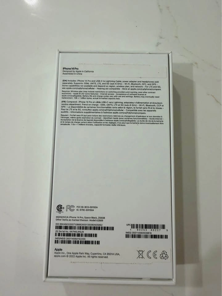 Mint condition iPhone 14 Pro, 256GB, black. Cord & Includes original box. 78% battery health. Case available if needed. Cloverdale area 64ave at 180th. It’s my wife phone.