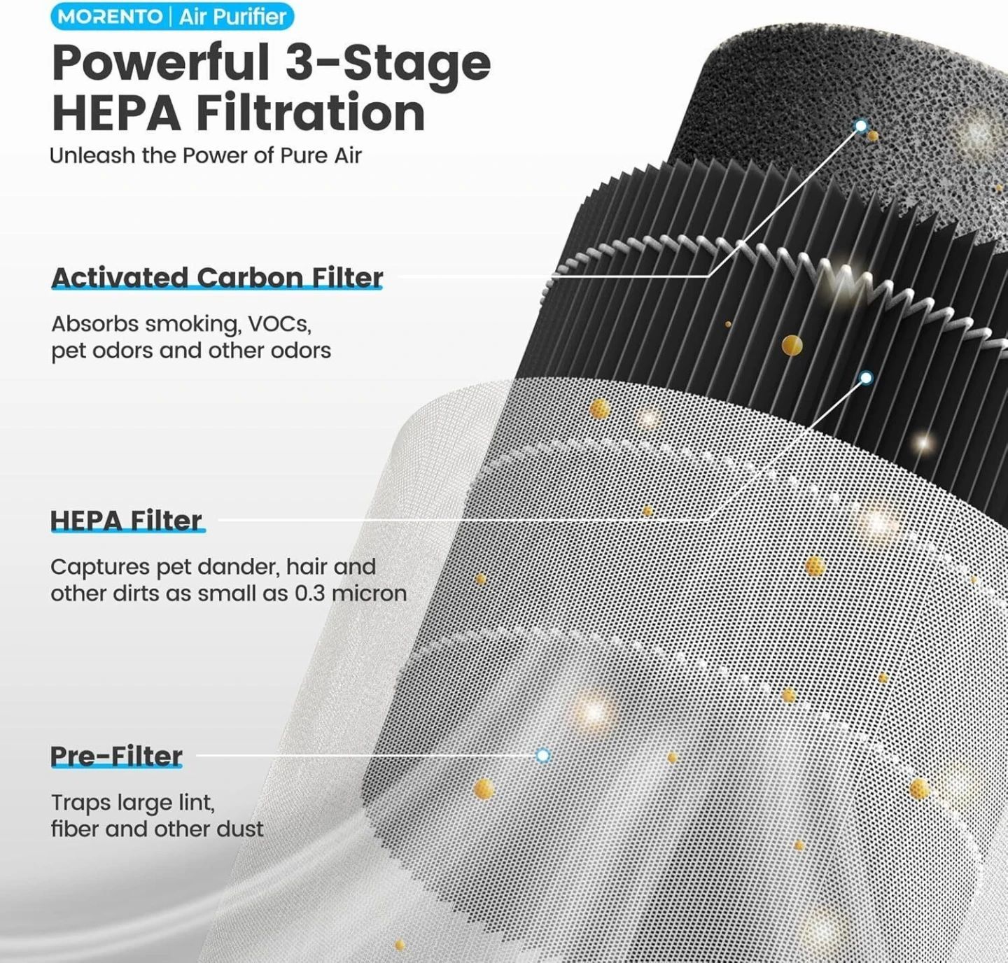 It features a powerful 3-stage HEPA filtration system to help keep your air clean. This includes a pre-filter, HEPA filter, and activated carbon filter. It's designed to freshen up every corner of your space with 360-degree clean air. It also has a whisper-quiet operation, perfect for helping you sleep better. The box is included!