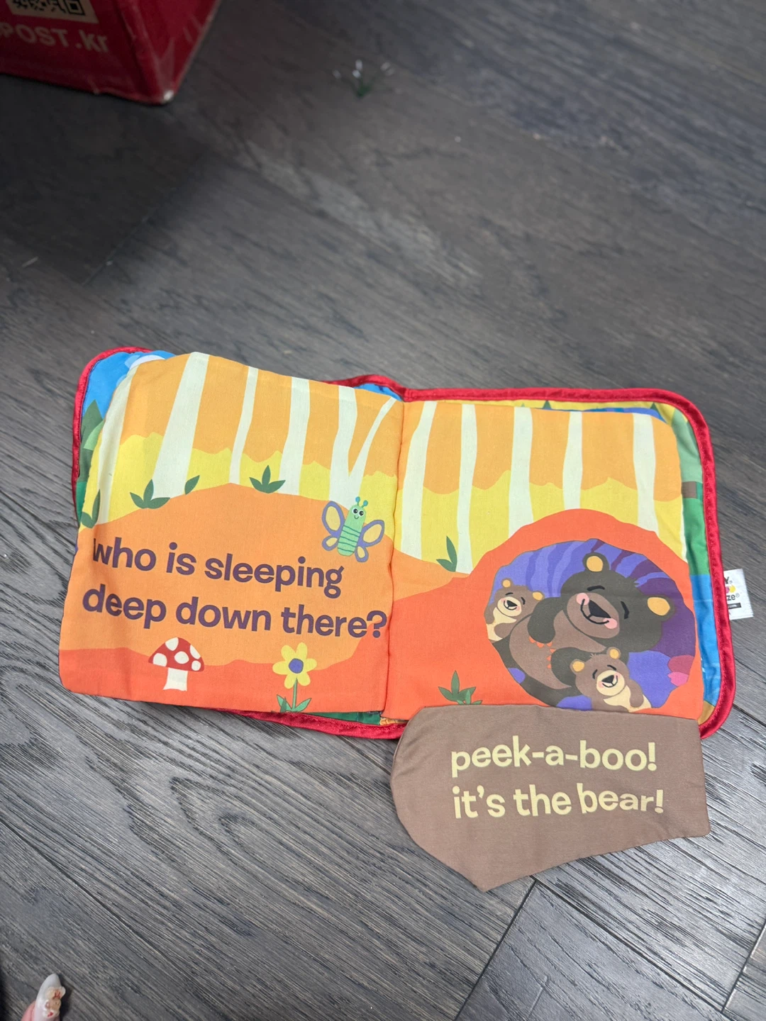 This is a soft book from Lamaze called Peek-A-Boo Forest! It's a great interactive toy for little ones. The book features bright colours and different textures to explore, perfect for sensory development