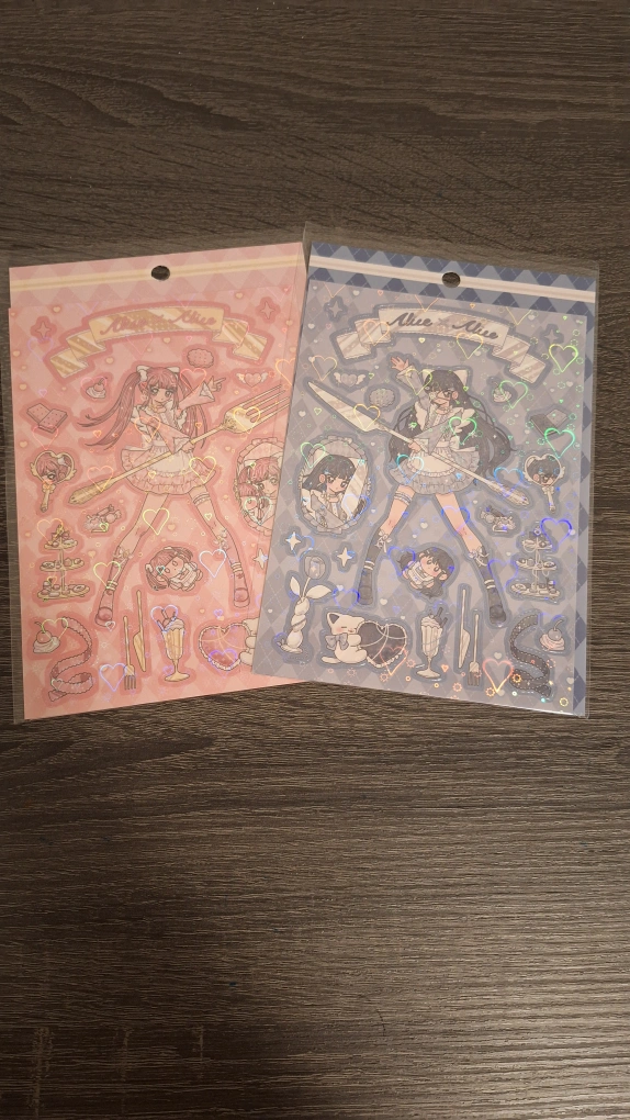 Two sets of Alice and the Pirates stickers featuring a variety of cute characters and images. These stickers are new and unused.