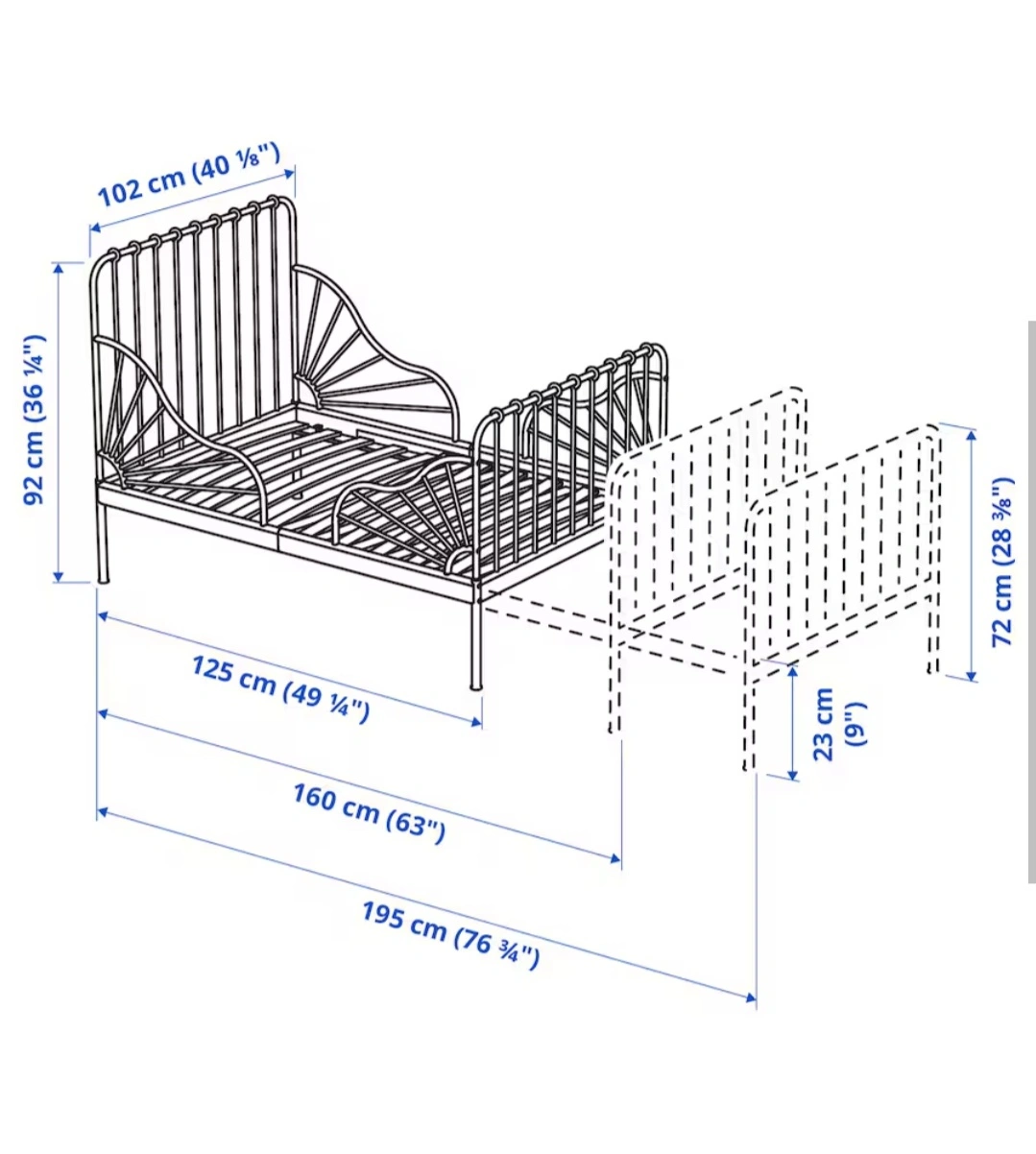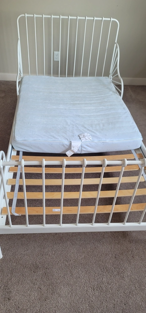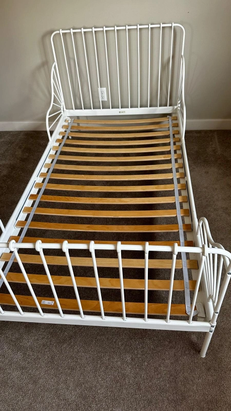 This is a white metal bed frame. It includes a slatted base and a decorative design. Kids/ junior adjustable white metal bed frame with LURÖY slatted bed base and PLUTTEN Foam mattress, all from IKEA. The bed frame was disassembled for easy transport. Pickup in Sherwood Park. OBO