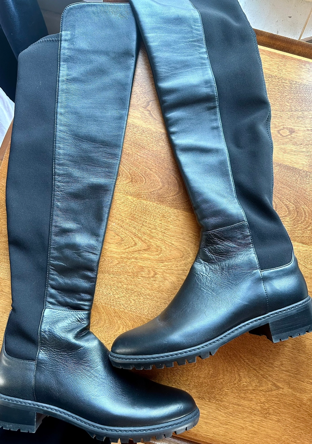 Black leather knee high Stuart Weitzman boots.The boots are made of genuine leather and have a stretch back panel and a great sole. Super for everyday comfort and style! Women’s size 7 and would fit a 7.5 or 8 comfortably.