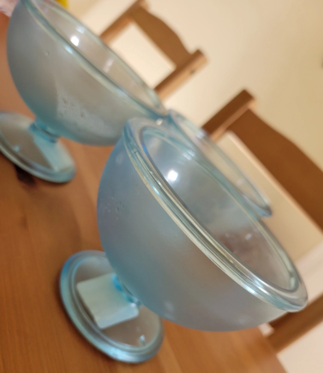 Set of 3 barely used blue plastic dessert bowls. Great for serving ice cream, desserts, candies, or other small snacks. The bowls have a fun aspect, containing water! Great for the summer!