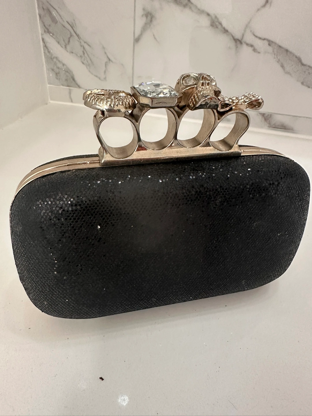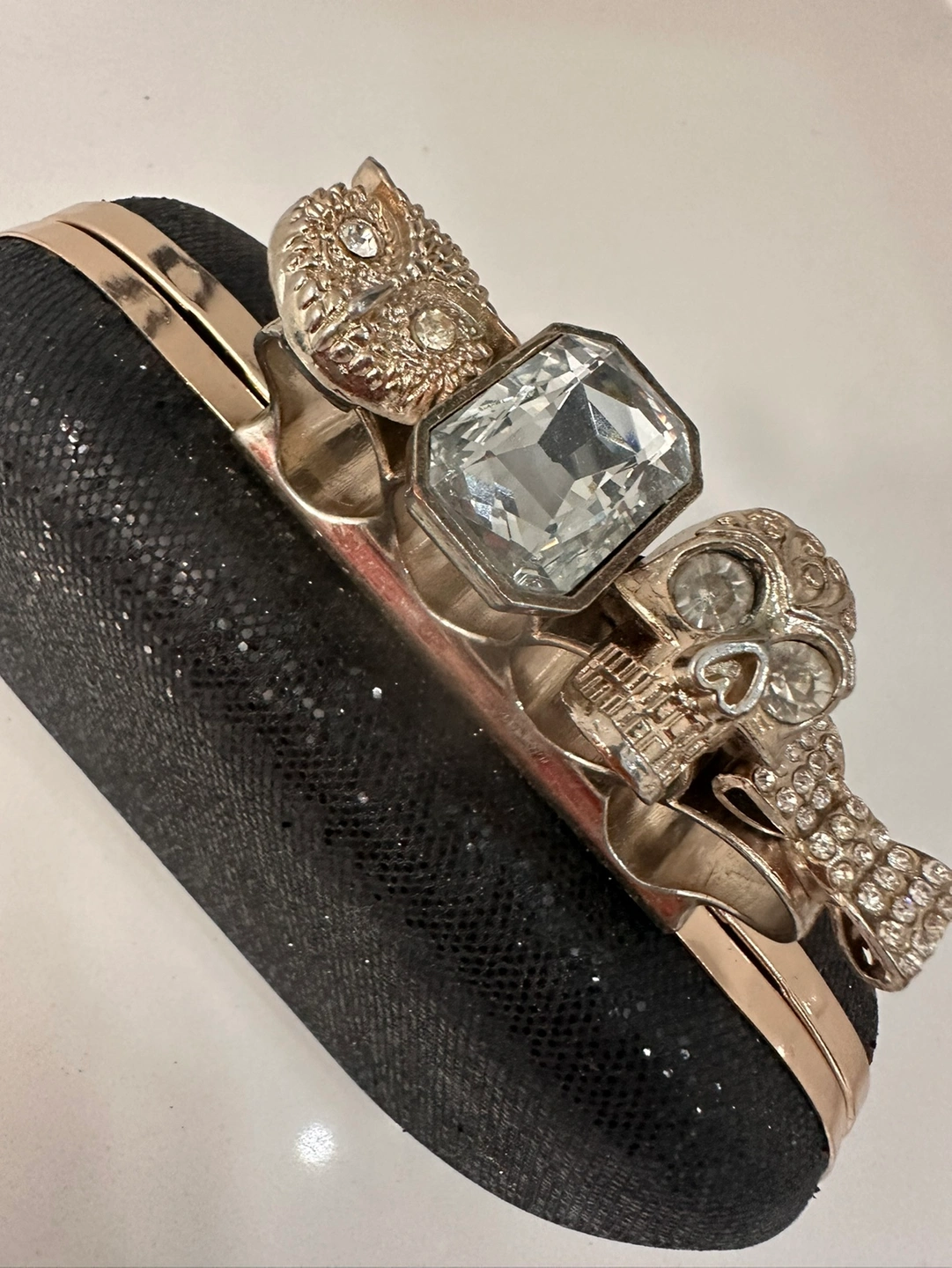 Sparkly black clutch with gold ring handle. The handle features a large crystal, a skull, and an owl.