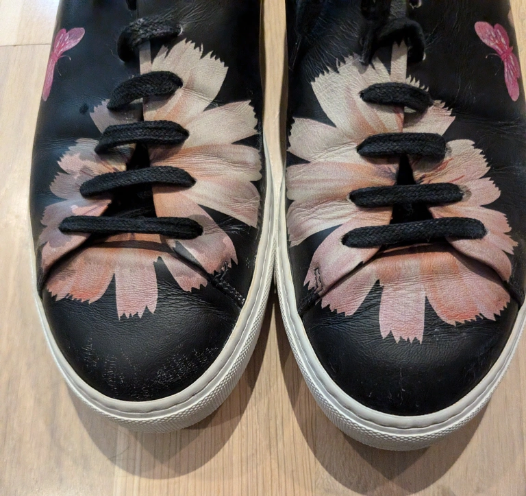 GORGEOUS black leather sneakers with colourful butterfly designs. They are a low top style. Lace up fastening.They are a luxurious handmade leather designer shoe from Milan, Italy. (please research online). These sneakers are meant for someone who wants a truly unique and trendy look. Although the shoes have some wear and tear or mild discolouration in rubber ( which can be whitened) , they are absolutely fabulous and I am sure you will turn heads and receive a lot of inquiries and compliments! Make me an offer! πŸ›’πŸ›οΈπŸ¦‹