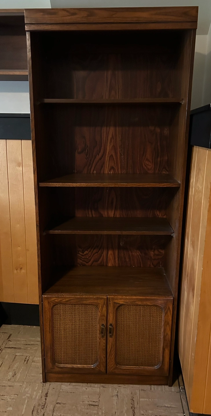 This is a tall bookcase with four shelves and double doors. The doors have a woven design.