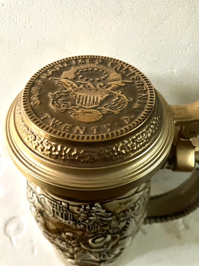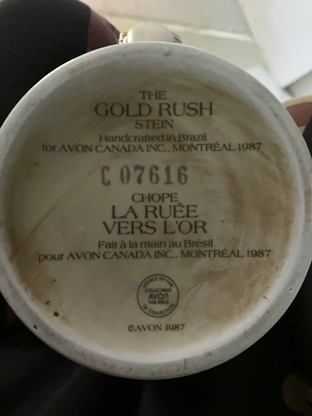 Vintage Avon The Gold Rush Stein, handcrafted in Brazil for Avon Canada. The Stein features a detailed depiction of a gold miner panning for gold. It has a gold-tone lid with a depiction of the San Francisco