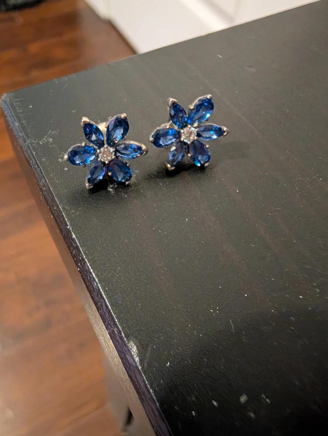 These pretty blue flower earrings feature a sparkling centre stone and petal-shaped blue gems. They're made of sterling silver, indicated by the "S925 ALE" stamp. These would be a lovely addition to any jewelry collection!