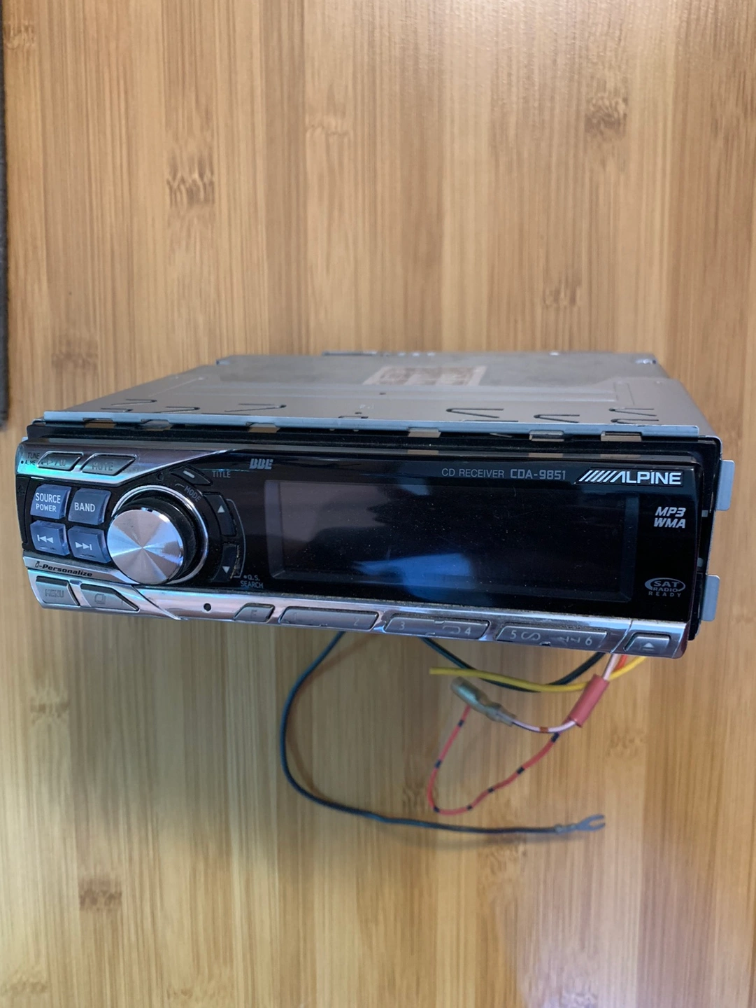 This is an Alpine CDA-9851 CD receiver with a remote control. It includes a faceplate. This receiver has a built-in amplifier with a max power output of 50 watts x 4 channels. It features a 3-band equalizer, RCA preamp outputs, and a detachable faceplate. It has an MP3/WMA playback function.