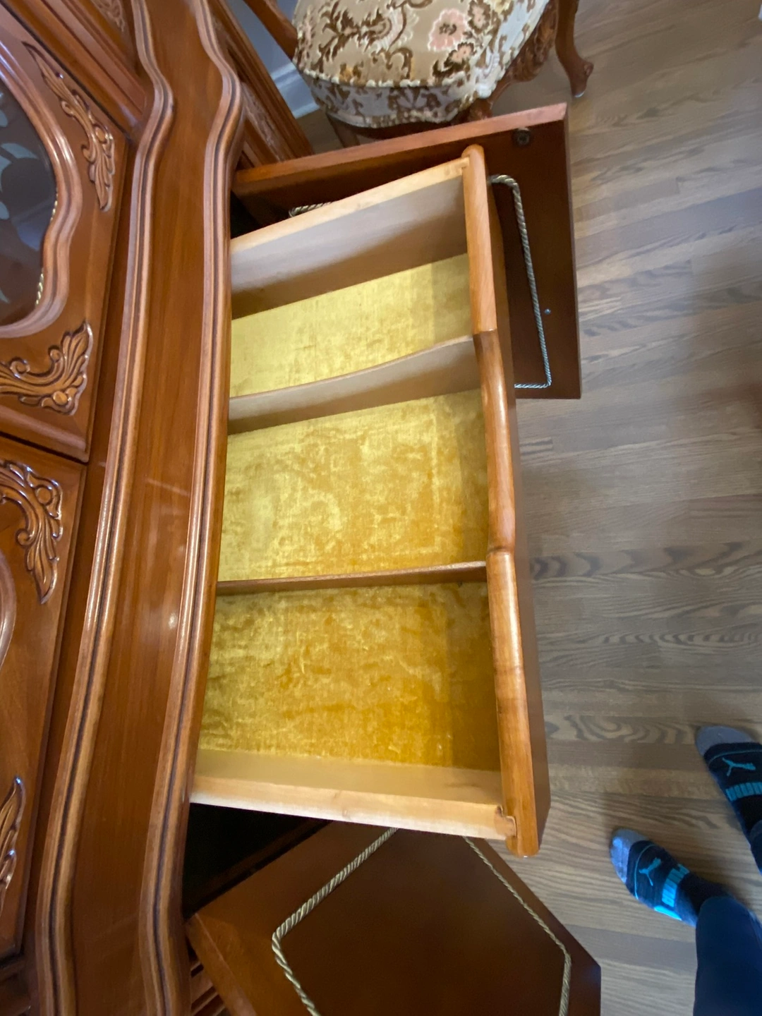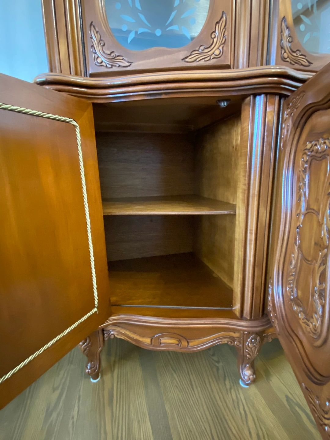 Solid Wood dining Room set includes 4 different chairs, dining room table with leaf insert and hutch with interior light. Rarely used, in mint condition with no scuffs or stains. Pet free and smoke free home. Seats are covered in velvet fabric.